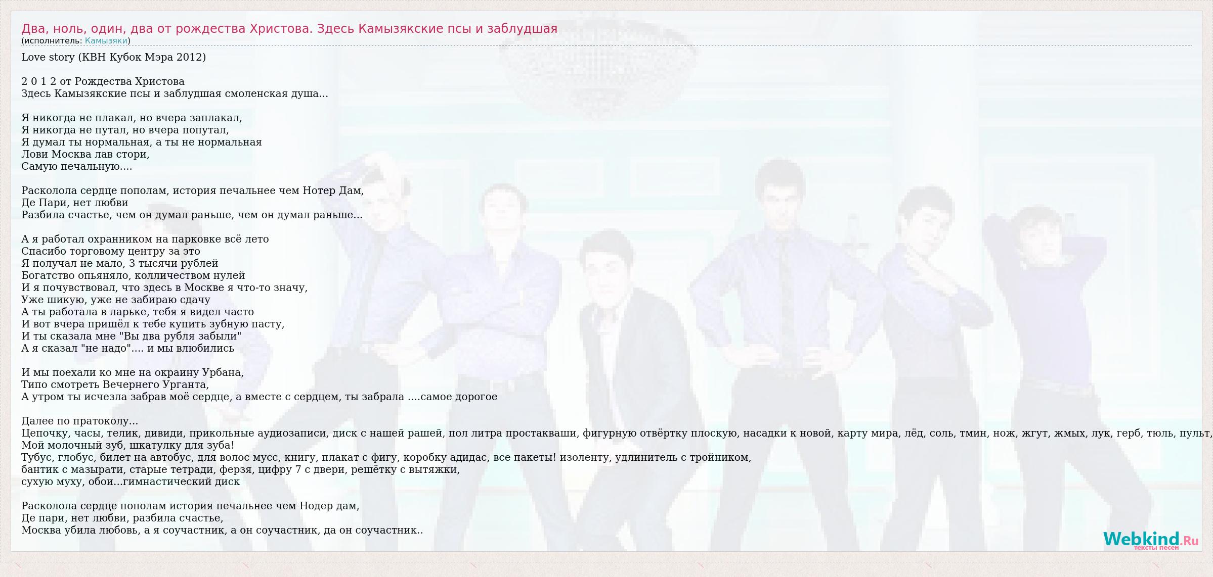 Love story (КВН Кубок Мэра 2012) 2 0 1 2 от Рождества Христова Здесь Камызякские псы и заблудшая смоленская душа... Я никогда не плакал, но вчера заплакал, Я никогда не путал, но вчера попутал, Я думал ты нормальная, а ты не нормальная Лови Москва лав стори, Самую печальную.... Расколола сердце пополам, история печальнее чем Нотер Дам, Де Пари, нет любви Разбила счастье, чем он думал раньше, чем он думал раньше... А я работал охранником на парковке всё лето Спасибо торговому центру за это Я получал не мало, 3 тысячи рублей Богатство опьяняло, колличеством нулей И я почувствовал, что здесь в Москве я что-то значу, Уже шикую, уже не забираю сдачу А ты работала в ларьке, тебя я видел часто И вот вчера пришёл к тебе купить зубную пасту, И ты сказала мне "Вы два рубля забыли" А я сказал "не надо".... и мы влюбились И мы поехали ко мне на окраину Урбана, Типо смотреть Вечернего Урганта, А утром ты исчезла забрав моё сердце, а вместе с сердцем, ты забрала ....самое дорогое Далее по пратоколу... Цепочку, часы, телик, дивиди, прикольные аудиозаписи, диск с нашей рашей, пол литра простакваши, фигурную отвёртку плоскую, насадки к новой, карту мира, лёд, соль, тмин, нож, жгут, жмых, лук, герб, тюль, пульт, Мой молочный зуб, шкатулку для зуба! Тубус, глобус, билет на автобус, для волос мусс, книгу, плакат с фигу, коробку адидас, все пакеты! изоленту, удлинитель с тройником, бантик с мазырати, старые тетради, ферзя, цифру 7 с двери, решётку с вытяжки, сухую муху, обои...гимнастический диск Расколола сердце пополам история печальнее чем Нодер дам, Де пари, нет любви, разбила счастье, Москва убила любовь, а я соучастник, а он соучастник, да он соучастник..