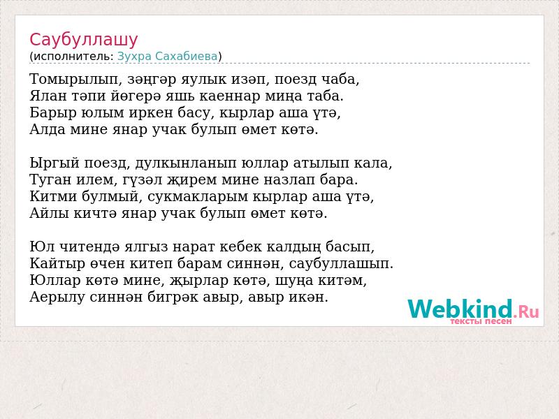Томырылып, зәңгәр яулык изәп, поезд чаба, Ялан тәпи йөгерә яшь каеннар миңа таба. Барыр юлым иркен басу, кырлар аша үтә, Алда мине янар учак булып өмет көтә. Ыргый поезд, дулкынланып юллар атылып кала, Туган илем, гүзәл җирем мине назлап бара. Китми булмый, сукмакларым кырлар аша үтә, Айлы кичтә янар учак булып өмет көтә. Юл читендә ялгыз нарат кебек калдың басып, Кайтыр өчен китеп барам синнән, саубуллашып. Юллар көтә мине, җырлар көтә, шуңа китәм, Аерылу синнән бигрәк авыр, авыр икән.