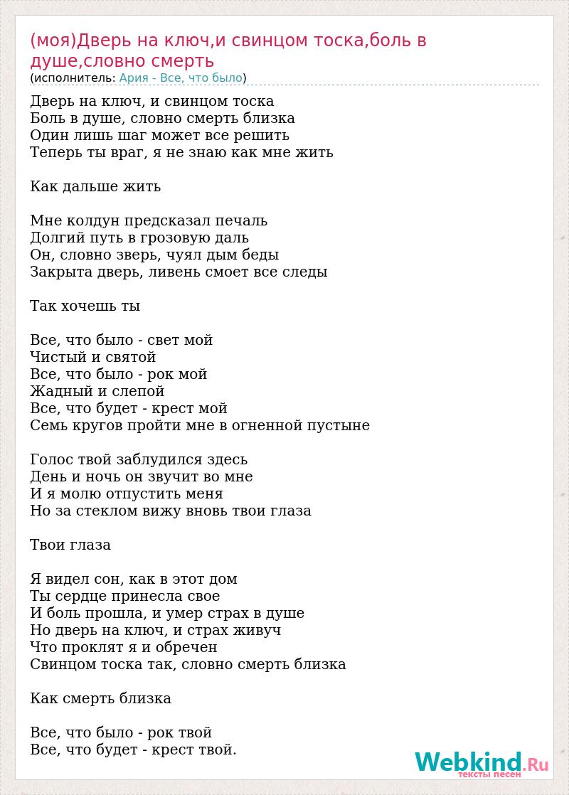 Дверь на ключ, и свинцом тоска Боль в душе, словно смерть близка Один лишь шаг может все решить Теперь ты враг, я не знаю как мне жить Как дальше жить Мне колдун предсказал печаль Долгий путь в грозовую даль Он, словно зверь, чуял дым беды Закрыта дверь, ливень смоет все следы Так хочешь ты Все, что было - свет мой Чистый и святой Все, что было - рок мой Жадный и слепой Все, что будет - крест мой Семь кругов пройти мне в огненной пустыне Голос твой заблудился здесь День и ночь он звучит во мне И я молю отпустить меня Но за стеклом вижу вновь твои глаза Твои глаза Я видел сон, как в этот дом Ты сердце принесла свое И боль прошла, и умер страх в душе Но дверь на ключ, и страх живуч Что проклят я и обречен Свинцом тоска так, словно смерть близка Как смерть близка Все, что было - рок твой Все, что будет - крест твой.
