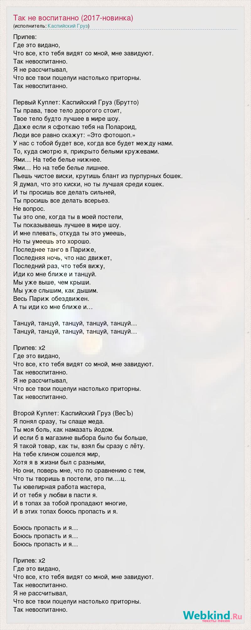 Припев: Где это видано, Что все, кто тебя видят со мной, мне завидуют. Так невоспитанно. Я не рассчитывал, Что все твои поцелуи настолько приторны. Так невоспитанно. Первый Куплет: Каспийский Груз (Брутто) Ты права, твое тело дорогого стоит, Твое тело будто лучшее в мире шоу. Даже если я сфоткаю тебя на Полароид, Люди все равно скажут: «Это фотошоп.» У нас с тобой будет все, когда все будет между нами. То, куда смотрю я, прикрыто белыми кружевами. Ями… На тебе белье нижнее. Ями… Но на тебе белье лишнее. Пьешь чистое виски, крутишь блант из пурпурных бошек. Я думал, что это киски, но ты лучшая среди кошек. И ты просишь все делать сильней, Ты просишь все делать всерьез. Не вопрос. Ты это one, когда ты в моей постели, Ты показываешь лучшее в мире шоу. И мне плевать, откуда ты это умеешь, Но ты умеешь это хорошо. Последнее танго в Париже, Последняя ночь, что нас движет, Последний раз, что тебя вижу, Иди ко мне ближе и танцуй. Мы уже выше, чем крыши. Мы уже слышим, как дышим. Весь Париж обездвижен. А ты иди ко мне ближе и… Танцуй, танцуй, танцуй, танцуй, танцуй… Танцуй, танцуй, танцуй, танцуй, танцуй… Припев: х2 Где это видано, Что все, кто тебя видят со мной, мне завидуют. Так невоспитанно. Я не рассчитывал, Что все твои поцелуи настолько приторны. Так невоспитанно. Второй Куплет: Каспийский Груз (ВесЪ) Я понял сразу, ты слаще меда. Ты моя боль, как намазать йодом. И если б в магазине выбора было бы больше, Я такой товар, как ты, взял бы сразу с лёту. На тебе клином сошелся мир, Хотя я в жизни был с разными, Но они, поверь мне, что по сравнению с тем, Что ты творишь в постели, это пи….ц. Ты ювелирная работа мастера, И от тебя у любви в пасти я. И в топах за тобой пропадают многие, И в этих топах боюсь пропасть и я. Боюсь пропасть и я… Боюсь пропасть и я… Боюсь пропасть и я… Припев: х2 Где это видано, Что все, кто тебя видят со мной, мне завидуют. Так невоспитанно. Я не рассчитывал, Что все твои поцелуи настолько приторны. Так невоспитанно.