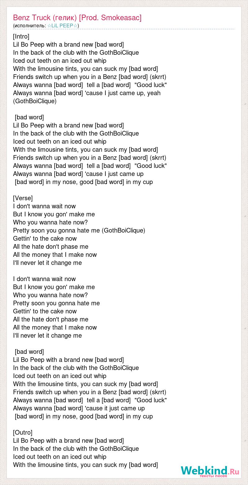 [Intro] Lil Bo Peep with a brand new [bad word] In the back of the club with the GothBoiClique Iced out teeth on an iced out whip With the limousine tints, you can suck my [bad word] Friends switch up when you in a Benz [bad word] (skrrt) Always wanna [bad word] tell a [bad word] "Good luck" Always wanna [bad word] 'cause I just came up, yeah (GothBoiClique) [bad word] Lil Bo Peep with a brand new [bad word] In the back of the club with the GothBoiClique Iced out teeth on an iced out whip With the limousine tints, you can suck my [bad word] Friends switch up when you in a Benz [bad word] (skrrt) Always wanna [bad word] tell a [bad word] "Good luck" Always wanna [bad word] 'cause I just came up [bad word] in my nose, good [bad word] in my cup [Verse] I don't wanna wait now But I know you gon' make me Who you wanna hate now? Pretty soon you gonna hate me (GothBoiClique) Gettin' to the cake now All the hate don't phase me All the money that I make now I'll never let it change me I don't wanna wait now But I know you gon' make me Who you wanna hate now? Pretty soon you gonna hate me Gettin' to the cake now All the hate don't phase me All the money that I make now I'll never let it change me [bad word] Lil Bo Peep with a brand new [bad word] In the back of the club with the GothBoiClique Iced out teeth on an iced out whip With the limousine tints, you can suck my [bad word] Friends switch up when you in a Benz [bad word] (skrrt) Always wanna [bad word] tell a [bad word] "Good luck" Always wanna [bad word] 'cause it just came up [bad word] in my nose, good [bad word] in my cup [Outro] Lil Bo Peep with a brand new [bad word] In the back of the club with the GothBoiClique Iced out teeth on an iced out whip With the limousine tints, you can suck my [bad word]