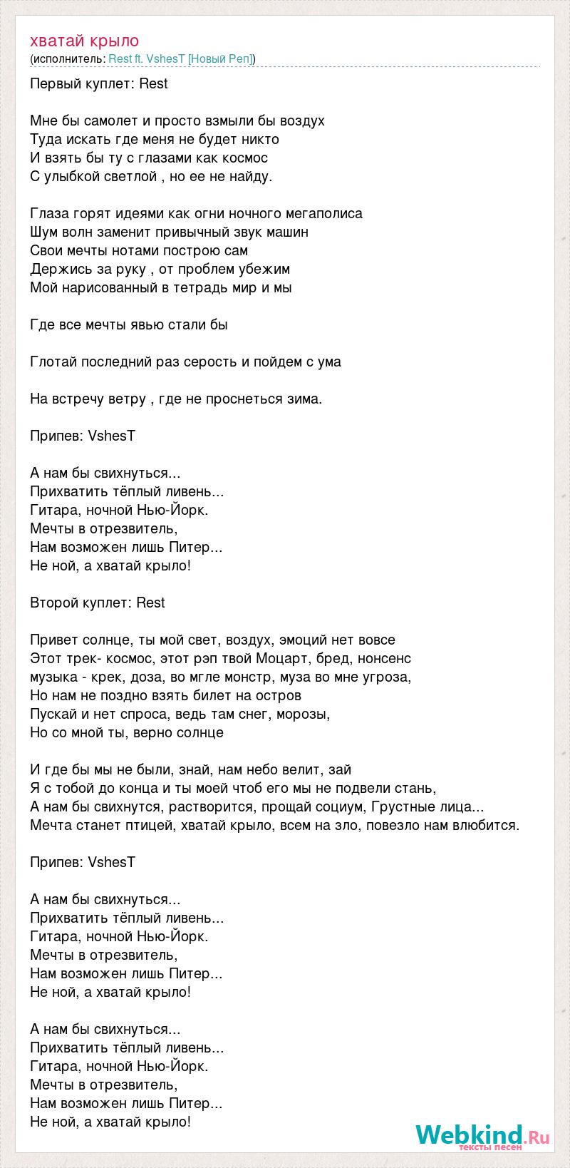 Первый куплет: Rest Мне бы самолет и просто взмыли бы воздух Туда искать где меня не будет никто И взять бы ту с глазами как космос С улыбкой светлой , но ее не найду. Глаза горят идеями как огни ночного мегаполиса Шум волн заменит привычный звук машин Свои мечты нотами построю сам Держись за руку , от проблем убежим Мой нарисованный в тетрадь мир и мы Где все мечты явью стали бы Глотай последний раз серость и пойдем с ума На встречу ветру , где не проснеться зима. Припев: VshesT А нам бы свихнуться... Прихватить тёплый ливень... Гитара, ночной Нью-Йорк. Мечты в отрезвитель, Нам возможен лишь Питер... Не ной, а хватай крыло! Второй куплет: Rest Привет солнце, ты мой свет, воздух, эмоций нет вовсе Этот трек- космос, этот рэп твой Моцарт, бред, нонсенс музыка - крек, доза, во мгле монстр, муза во мне угроза, Но нам не поздно взять билет на остров Пускай и нет спроса, ведь там снег, морозы, Но со мной ты, верно солнце И где бы мы не были, знай, нам небо велит, зай Я с тобой до конца и ты моей чтоб его мы не подвели стань, А нам бы свихнутся, растворится, прощай социум, Грустные лица... Мечта станет птицей, хватай крыло, всем на зло, повезло нам влюбится. Припев: VshesT А нам бы свихнуться... Прихватить тёплый ливень... Гитара, ночной Нью-Йорк. Мечты в отрезвитель, Нам возможен лишь Питер... Не ной, а хватай крыло! А нам бы свихнуться... Прихватить тёплый ливень... Гитара, ночной Нью-Йорк. Мечты в отрезвитель, Нам возможен лишь Питер... Не ной, а хватай крыло!
