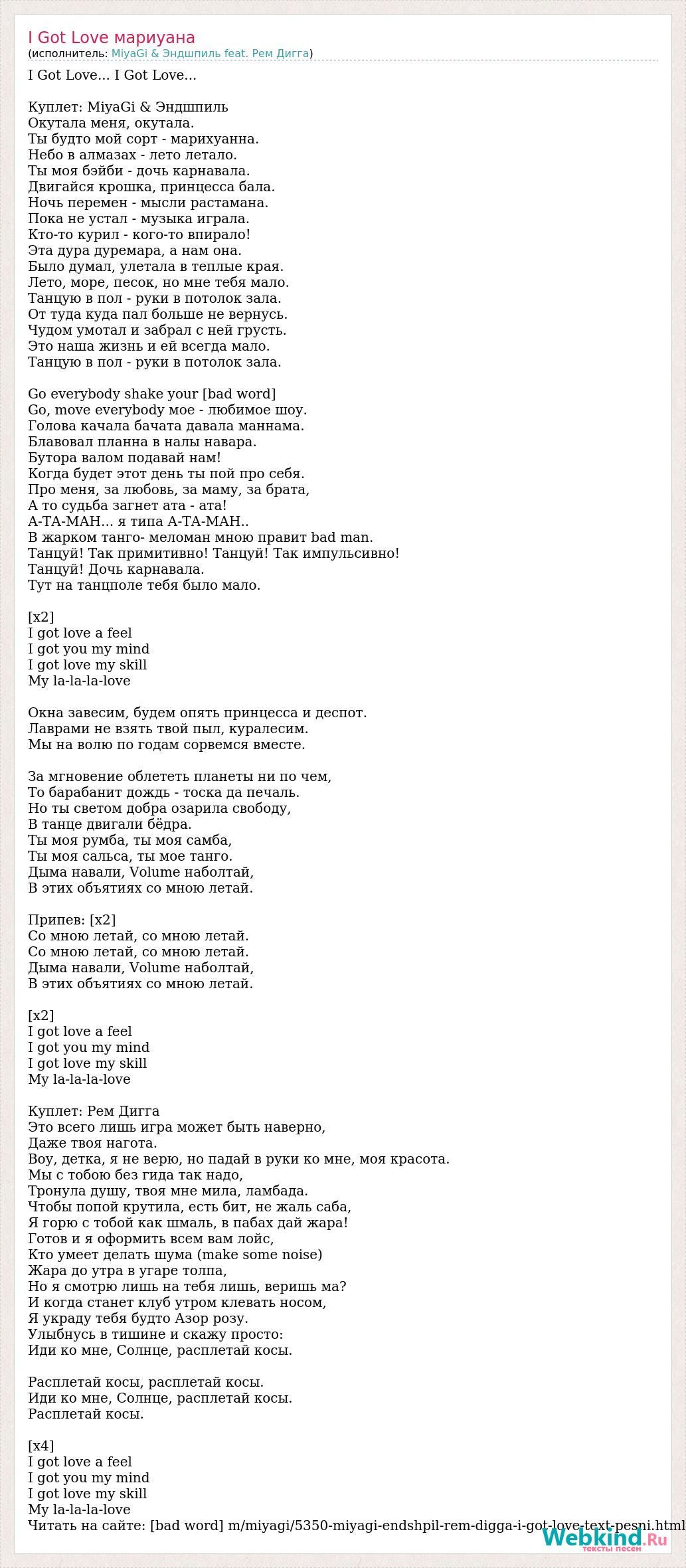 I Got Love... I Got Love... Куплет: MiyaGi & Эндшпиль Окутала меня, окутала. Ты будто мой сорт - марихуанна. Небо в алмазах - лето летало. Ты моя бэйби - дочь карнавала. Двигайся крошка, принцесса бала. Ночь перемен - мысли растамана. Пока не устал - музыка играла. Кто-то курил - кого-то впирало! Эта дура дуремара, а нам она. Было думал, улетала в теплые края. Лето, море, песок, но мне тебя мало. Танцую в пол - руки в потолок зала. От туда куда пал больше не вернусь. Чудом умотал и забрал с ней грусть. Это наша жизнь и ей всегда мало. Танцую в пол - руки в потолок зала. Go everybody shake your [bad word] Go, move everybody мое - любимое шоу. Голова качала бачата давала маннама. Блавовал планна в налы навара. Бутора валом подавай нам! Когда будет этот день ты пой про себя. Про меня, за любовь, за маму, за брата, А то судьба загнет ата - ата! А-ТА-МАН... я типа А-ТА-МАН.. В жарком танго- меломан мною правит bad man. Танцуй! Так примитивно! Танцуй! Так импульсивно! Танцуй! Дочь карнавала. Тут на танцполе тебя было мало. [x2] I got love a feel I got you my mind I got love my skill My la-la-la-love Окна завесим, будем опять принцесса и деспот. Лаврами не взять твой пыл, куралесим. Мы на волю по годам сорвемся вместе. За мгновение облететь планеты ни по чем, То барабанит дождь - тоска да печаль. Но ты светом добра озарила свободу, В танце двигали бёдра. Ты моя румба, ты моя самба, Ты моя сальса, ты мое танго. Дыма навали, Volume наболтай, В этих объятиях со мною летай. Припев: [х2] Со мною летай, со мною летай. Со мною летай, со мною летай. Дыма навали, Volume наболтай, В этих объятиях со мною летай. [х2] I got love a feel I got you my mind I got love my skill My la-la-la-love Куплет: Рем Дигга Это всего лишь игра может быть наверно, Даже твоя нагота. Воу, детка, я не верю, но падай в руки ко мне, моя красота. Мы с тобою без гида так надо, Тронула душу, твоя мне мила, ламбада. Чтобы попой крутила, есть бит, не жаль саба, Я горю с тобой как шмаль, в пабах дай жара! Готов и я оформить всем вам лойс, Кто умеет делать шума (make some noise) Жара до утра в угаре толпа, Но я смотрю лишь на тебя лишь, веришь ма? И когда станет клуб утром клевать носом, Я украду тебя будто Азор розу. Улыбнусь в тишине и скажу просто: Иди ко мне, Солнце, расплетай косы. Расплетай косы, расплетай косы. Иди ко мне, Солнце, расплетай косы. Расплетай косы. [x4] I got love a feel I got you my mind I got love my skill My la-la-la-love Читать на сайте: [bad word] m/miyagi/5350-miyagi-endshpil-rem-digga-i-got-love-text-pesni.html