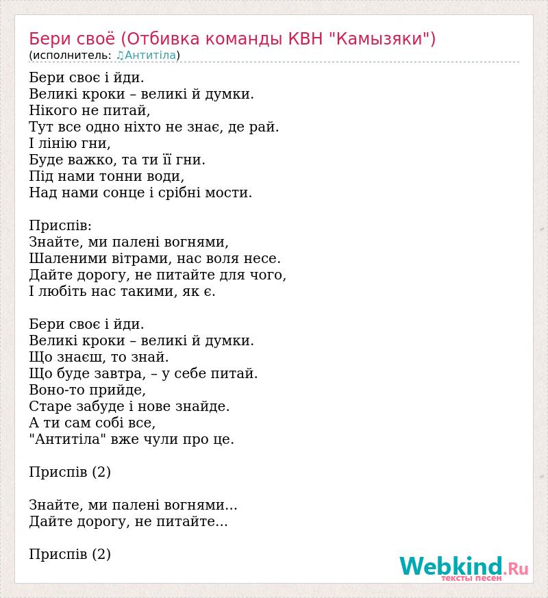 Бери своє і йди. Великі кроки – великі й думки. Нікого не питай, Тут все одно ніхто не знає, де рай. І лінію гни, Буде важко, та ти її гни. Під нами тонни води, Над нами сонце і срібні мости. Приспів: Знайте, ми палені вогнями, Шаленими вітрами, нас воля несе. Дайте дорогу, не питайте для чого, І любіть нас такими, як є. Бери своє і йди. Великі кроки – великі й думки. Що знаєш, то знай. Що буде завтра, – у себе питай. Воно-то прийде, Старе забуде і нове знайде. А ти сам собі все, "Антитіла" вже чули про це. Приспів (2) Знайте, ми палені вогнями... Дайте дорогу, не питайте... Приспів (2)