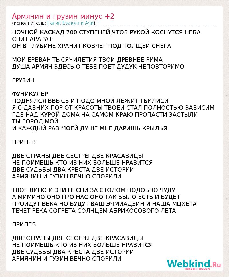 НОЧНОЙ КАСКАД 700 СТУПЕНЕЙ,ЧТОБ РУКОЙ КОСНУТСЯ НЕБА СПИТ АРАРАТ ОН В ГЛУБИНЕ ХРАНИТ КОВЧЕГ ПОД ТОЛЩЕЙ СНЕГА МОЙ ЕРЕВАН ТЫСЯЧИЛЕТИЯ ТВОИ ДРЕВНЕЕ РИМА ДУША АРМЯН ЗДЕСЬ О ТЕБЕ ПОЕТ ДУДУК НЕПОВТОРИМО ГРУЗИН ФУНИКУЛЕР ПОДНЯЛСЯ ВВЫСЬ И ПОДО МНОЙ ЛЕЖИТ ТБИЛИСИ Я С ДАВНИХ ПОР ОТ КРАСОТЫ ТВОЕЙ СТАЛ ПОЛНОСТЬЮ ЗАВИСИМ ГДЕ НАД КУРОЙ ДОМА НА САМОМ КРАЮ ПРОПАСТИ ЗАСТЫЛИ ТЫ ГОРОД МОЙ И КАЖДЫЙ РАЗ МОЕЙ ДУШЕ МНЕ ДАРИШЬ КРЫЛЬЯ ПРИПЕВ ДВЕ СТРАНЫ ДВЕ СЕСТРЫ ДВЕ КРАСАВИЦЫ НЕ ПОЙМЕШЬ КТО ИЗ НИХ БОЛЬШЕ НРАВИТСЯ ДВЕ СУДЬБЫ ДВА КРЕСТА ДВЕ ИСТОРИИ АРМЯНИН И ГУЗИН ВЕЧНО СПОРИЛИ ТВОЕ ВИНО И ЭТИ ПЕСНИ ЗА СТОЛОМ ПОДОБНО ЧУДУ А МИМИНО ОНО ПРО НАС ОНО ТАК БЫЛО ЕСТЬ И БУДЕТ ПРОЙДУТ ВЕКА НО БУДУТ ВАШ ЭЧМИАДЗИН И НАША МЦХЕТА ТЕЧЕТ РЕКА СОГРЕТА СОЛНЦЕМ АБРИКОСОВОГО ЛЕТА ПРИПЕВ ДВЕ СТРАНЫ ДВЕ СЕСТРЫ ДВЕ КРАСАВИЦЫ НЕ ПОЙМЕШЬ КТО ИЗ НИХ БОЛЬШЕ НРАВИТСЯ ДВЕ СУДЬБЫ ДВА КРЕСТА ДВЕ ИСТОРИИ АРМЯНИН И ГУЗИН ВЕЧНО СПОРИЛИ