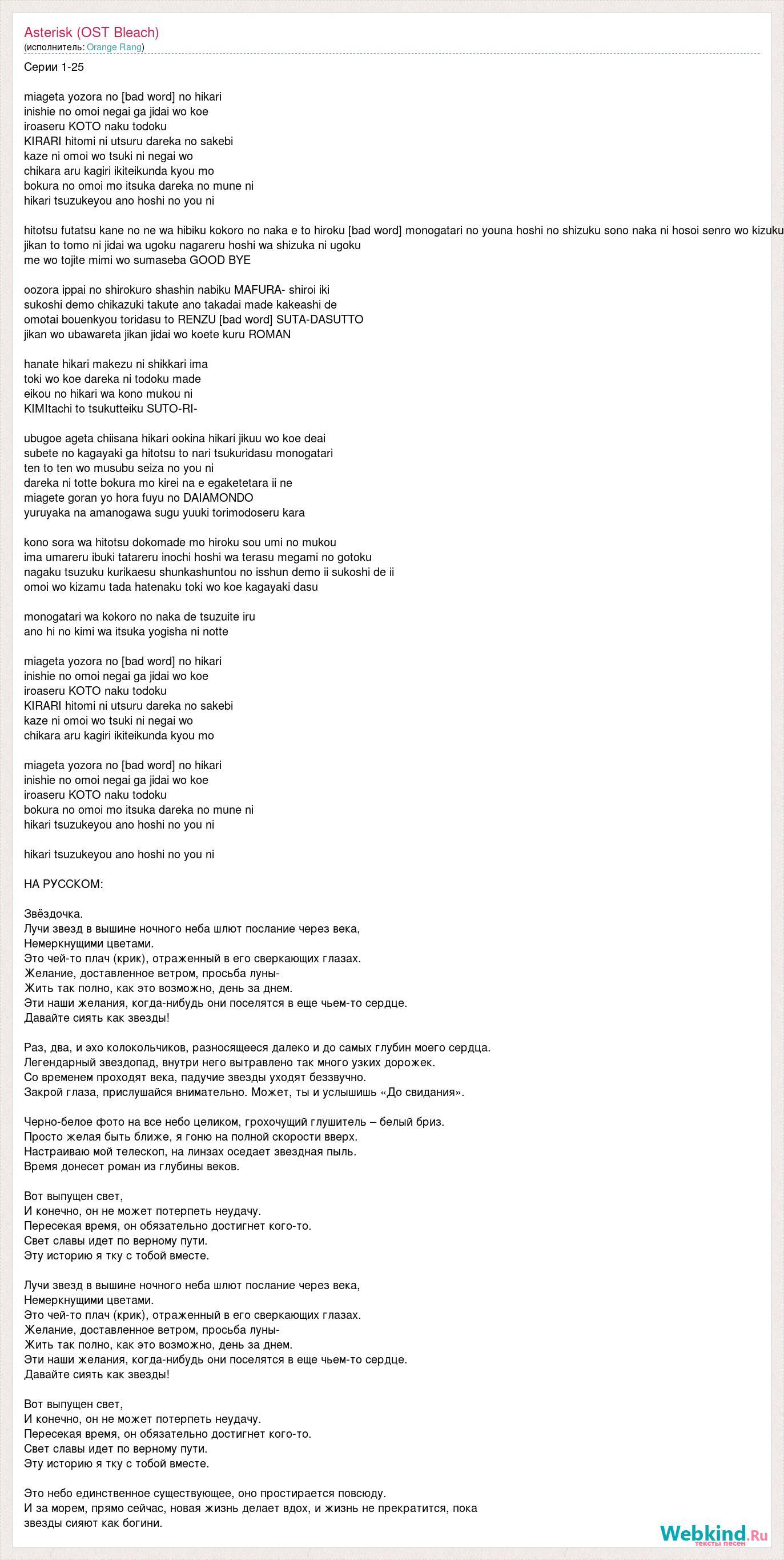 Серии 1-25 miageta yozora no [bad word] no hikari inishie no omoi negai ga jidai wo koe iroaseru KOTO naku todoku KIRARI hitomi ni utsuru dareka no sakebi kaze ni omoi wo tsuki ni negai wo chikara aru kagiri ikiteikunda kyou mo bokura no omoi mo itsuka dareka no mune ni hikari tsuzukeyou ano hoshi no you ni hitotsu futatsu kane no ne wa hibiku kokoro no naka e to hiroku [bad word] monogatari no youna hoshi no shizuku sono naka ni hosoi senro wo kizuku jikan to tomo ni jidai wa ugoku nagareru hoshi wa shizuka ni ugoku me wo tojite mimi wo sumaseba GOOD BYE oozora ippai no shirokuro shashin nabiku MAFURA- shiroi iki sukoshi demo chikazuki takute ano takadai made kakeashi de omotai bouenkyou toridasu to RENZU [bad word] SUTA-DASUTTO jikan wo ubawareta jikan jidai wo koete kuru ROMAN hanate hikari makezu ni shikkari ima toki wo koe dareka ni todoku made eikou no hikari wa kono mukou ni KIMItachi to tsukutteiku SUTO-RI- ubugoe ageta chiisana hikari ookina hikari jikuu wo koe deai subete no kagayaki ga hitotsu to nari tsukuridasu monogatari ten to ten wo musubu seiza no you ni dareka ni totte bokura mo kirei na e egaketetara ii ne miagete goran yo hora fuyu no DAIAMONDO yuruyaka na amanogawa sugu yuuki torimodoseru kara kono sora wa hitotsu dokomade mo hiroku sou umi no mukou ima umareru ibuki tatareru inochi hoshi wa terasu megami no gotoku nagaku tsuzuku kurikaesu shunkashuntou no isshun demo ii sukoshi de ii omoi wo kizamu tada hatenaku toki wo koe kagayaki dasu monogatari wa kokoro no naka de tsuzuite iru ano hi no kimi wa itsuka yogisha ni notte miageta yozora no [bad word] no hikari inishie no omoi negai ga jidai wo koe iroaseru KOTO naku todoku KIRARI hitomi ni utsuru dareka no sakebi kaze ni omoi wo tsuki ni negai wo chikara aru kagiri ikiteikunda kyou mo miageta yozora no [bad word] no hikari inishie no omoi negai ga jidai wo koe iroaseru KOTO naku todoku bokura no omoi mo itsuka dareka no mune ni hikari tsuzukeyou ano hoshi no you ni hikari tsuzukeyou ano hoshi no you ni НА РУССКОМ: Звёздочка. Лучи звезд в вышине ночного неба шлют послание через века, Немеркнущими цветами. Это чей-то плач (крик), отраженный в его сверкающих глазах. Желание, доставленное ветром, просьба луны- Жить так полно, как это возможно, день за днем. Эти наши желания, когда-нибудь они поселятся в еще чьем-то сердце. Давайте сиять как звезды! Раз, два, и эхо колокольчиков, разносящееся далеко и до самых глубин моего сердца. Легендарный звездопад, внутри него вытравлено так много узких дорожек. Со временем проходят века, падучие звезды уходят беззвучно. Закрой глаза, прислушайся внимательно. Может, ты и услышишь «До свидания». Черно-белое фото на все небо целиком, грохочущий глушитель – белый бриз. Просто желая быть ближе, я гоню на полной скорости вверх. Настраиваю мой телескоп, на линзах оседает звездная пыль. Время донесет роман из глубины веков. Вот выпущен свет, И конечно, он не может потерпеть неудачу. Пересекая время, он обязательно достигнет кого-то. Свет славы идет по верному пути. Эту историю я тку с тобой вместе. Лучи звезд в вышине ночного неба шлют послание через века, Немеркнущими цветами. Это чей-то плач (крик), отраженный в его сверкающих глазах. Желание, доставленное ветром, просьба луны- Жить так полно, как это возможно, день за днем. Эти наши желания, когда-нибудь они поселятся в еще чьем-то сердце. Давайте сиять как звезды! Вот выпущен свет, И конечно, он не может потерпеть неудачу. Пересекая время, он обязательно достигнет кого-то. Свет славы идет по верному пути. Эту историю я тку с тобой вместе. Это небо единственное существующее, оно простирается повсюду. И за морем, прямо сейчас, новая жизнь делает вдох, и жизнь не прекратится, пока звезды сияют как богини.