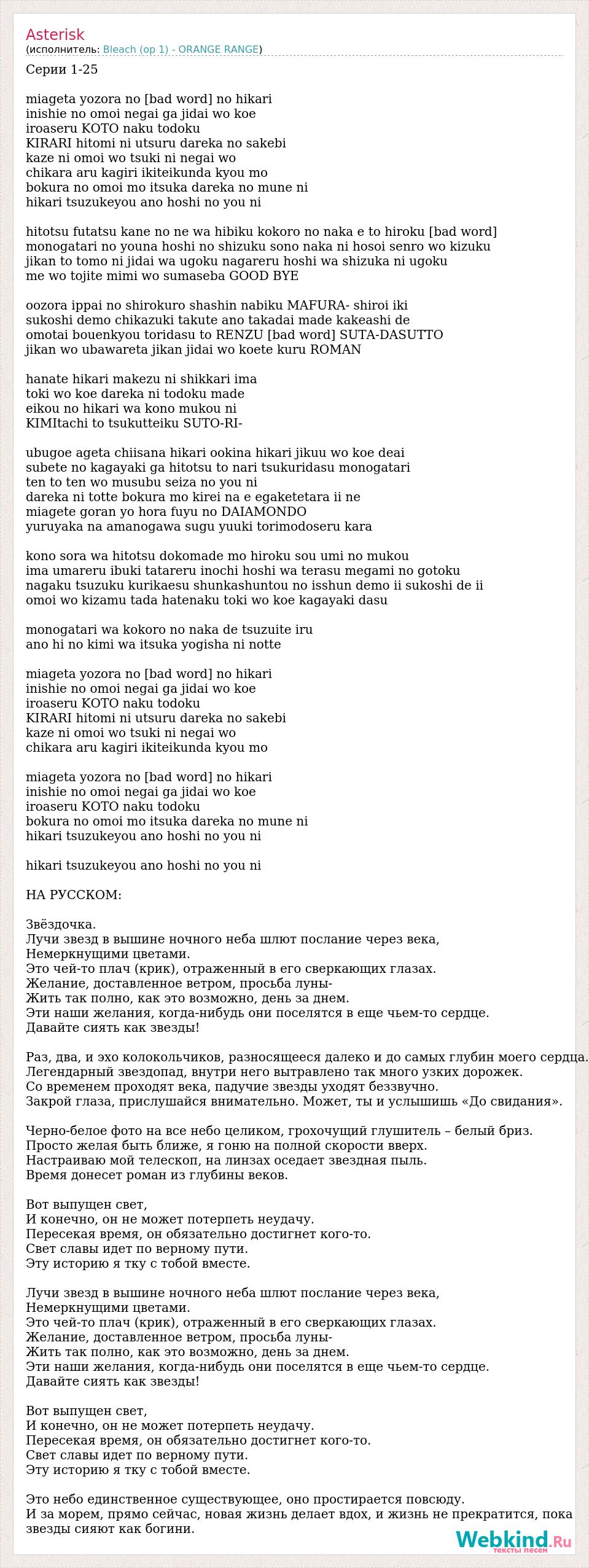 Серии 1-25 miageta yozora no [bad word] no hikari inishie no omoi negai ga jidai wo koe iroaseru KOTO naku todoku KIRARI hitomi ni utsuru dareka no sakebi kaze ni omoi wo tsuki ni negai wo chikara aru kagiri ikiteikunda kyou mo bokura no omoi mo itsuka dareka no mune ni hikari tsuzukeyou ano hoshi no you ni hitotsu futatsu kane no ne wa hibiku kokoro no naka e to hiroku [bad word] monogatari no youna hoshi no shizuku sono naka ni hosoi senro wo kizuku jikan to tomo ni jidai wa ugoku nagareru hoshi wa shizuka ni ugoku me wo tojite mimi wo sumaseba GOOD BYE oozora ippai no shirokuro shashin nabiku MAFURA- shiroi iki sukoshi demo chikazuki takute ano takadai made kakeashi de omotai bouenkyou toridasu to RENZU [bad word] SUTA-DASUTTO jikan wo ubawareta jikan jidai wo koete kuru ROMAN hanate hikari makezu ni shikkari ima toki wo koe dareka ni todoku made eikou no hikari wa kono mukou ni KIMItachi to tsukutteiku SUTO-RI- ubugoe ageta chiisana hikari ookina hikari jikuu wo koe deai subete no kagayaki ga hitotsu to nari tsukuridasu monogatari ten to ten wo musubu seiza no you ni dareka ni totte bokura mo kirei na e egaketetara ii ne miagete goran yo hora fuyu no DAIAMONDO yuruyaka na amanogawa sugu yuuki torimodoseru kara kono sora wa hitotsu dokomade mo hiroku sou umi no mukou ima umareru ibuki tatareru inochi hoshi wa terasu megami no gotoku nagaku tsuzuku kurikaesu shunkashuntou no isshun demo ii sukoshi de ii omoi wo kizamu tada hatenaku toki wo koe kagayaki dasu monogatari wa kokoro no naka de tsuzuite iru ano hi no kimi wa itsuka yogisha ni notte miageta yozora no [bad word] no hikari inishie no omoi negai ga jidai wo koe iroaseru KOTO naku todoku KIRARI hitomi ni utsuru dareka no sakebi kaze ni omoi wo tsuki ni negai wo chikara aru kagiri ikiteikunda kyou mo miageta yozora no [bad word] no hikari inishie no omoi negai ga jidai wo koe iroaseru KOTO naku todoku bokura no omoi mo itsuka dareka no mune ni hikari tsuzukeyou ano hoshi no you ni hikari tsuzukeyou ano hoshi no you ni НА РУССКОМ: Звёздочка. Лучи звезд в вышине ночного неба шлют послание через века, Немеркнущими цветами. Это чей-то плач (крик), отраженный в его сверкающих глазах. Желание, доставленное ветром, просьба луны- Жить так полно, как это возможно, день за днем. Эти наши желания, когда-нибудь они поселятся в еще чьем-то сердце. Давайте сиять как звезды! Раз, два, и эхо колокольчиков, разносящееся далеко и до самых глубин моего сердца. Легендарный звездопад, внутри него вытравлено так много узких дорожек. Со временем проходят века, падучие звезды уходят беззвучно. Закрой глаза, прислушайся внимательно. Может, ты и услышишь «До свидания». Черно-белое фото на все небо целиком, грохочущий глушитель – белый бриз. Просто желая быть ближе, я гоню на полной скорости вверх. Настраиваю мой телескоп, на линзах оседает звездная пыль. Время донесет роман из глубины веков. Вот выпущен свет, И конечно, он не может потерпеть неудачу. Пересекая время, он обязательно достигнет кого-то. Свет славы идет по верному пути. Эту историю я тку с тобой вместе. Лучи звезд в вышине ночного неба шлют послание через века, Немеркнущими цветами. Это чей-то плач (крик), отраженный в его сверкающих глазах. Желание, доставленное ветром, просьба луны- Жить так полно, как это возможно, день за днем. Эти наши желания, когда-нибудь они поселятся в еще чьем-то сердце. Давайте сиять как звезды! Вот выпущен свет, И конечно, он не может потерпеть неудачу. Пересекая время, он обязательно достигнет кого-то. Свет славы идет по верному пути. Эту историю я тку с тобой вместе. Это небо единственное существующее, оно простирается повсюду. И за морем, прямо сейчас, новая жизнь делает вдох, и жизнь не прекратится, пока звезды сияют как богини.