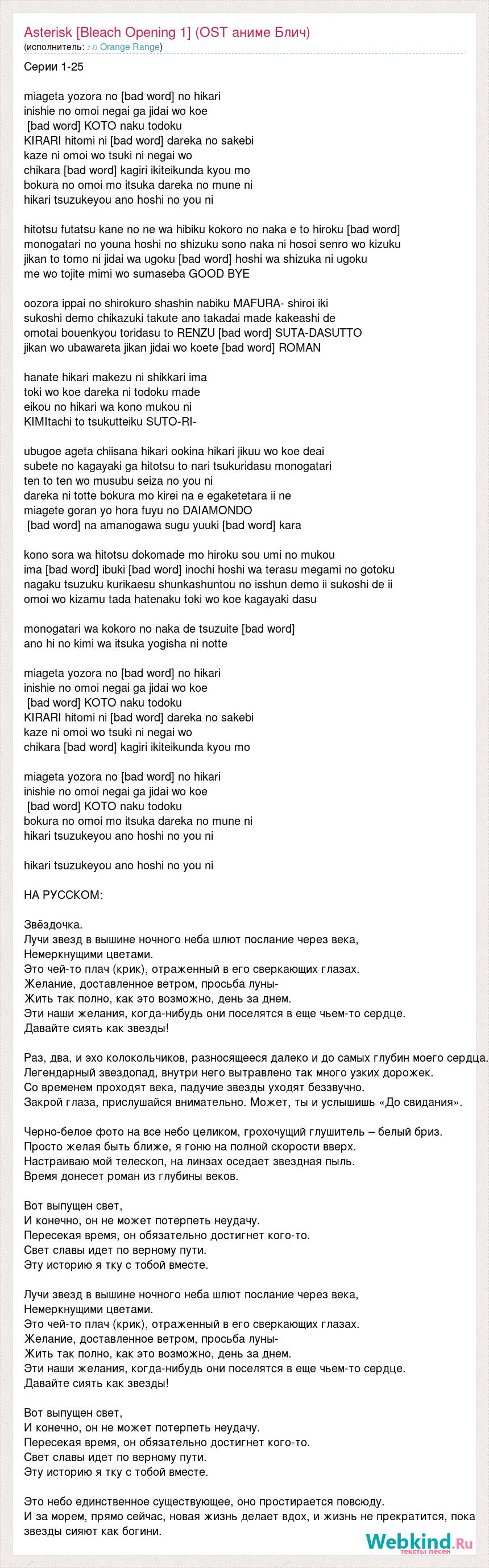 Серии 1-25 miageta yozora no [bad word] no hikari inishie no omoi negai ga jidai wo koe [bad word] KOTO naku todoku KIRARI hitomi ni [bad word] dareka no sakebi kaze ni omoi wo tsuki ni negai wo chikara [bad word] kagiri ikiteikunda kyou mo bokura no omoi mo itsuka dareka no mune ni hikari tsuzukeyou ano hoshi no you ni hitotsu futatsu kane no ne wa hibiku kokoro no naka e to hiroku [bad word] monogatari no youna hoshi no shizuku sono naka ni hosoi senro wo kizuku jikan to tomo ni jidai wa ugoku [bad word] hoshi wa shizuka ni ugoku me wo tojite mimi wo sumaseba GOOD BYE oozora ippai no shirokuro shashin nabiku MAFURA- shiroi iki sukoshi demo chikazuki takute ano takadai made kakeashi de omotai bouenkyou toridasu to RENZU [bad word] SUTA-DASUTTO jikan wo ubawareta jikan jidai wo koete [bad word] ROMAN hanate hikari makezu ni shikkari ima toki wo koe dareka ni todoku made eikou no hikari wa kono mukou ni KIMItachi to tsukutteiku SUTO-RI- ubugoe ageta chiisana hikari ookina hikari jikuu wo koe deai subete no kagayaki ga hitotsu to nari tsukuridasu monogatari ten to ten wo musubu seiza no you ni dareka ni totte bokura mo kirei na e egaketetara ii ne miagete goran yo hora fuyu no DAIAMONDO [bad word] na amanogawa sugu yuuki [bad word] kara kono sora wa hitotsu dokomade mo hiroku sou umi no mukou ima [bad word] ibuki [bad word] inochi hoshi wa terasu megami no gotoku nagaku tsuzuku kurikaesu shunkashuntou no isshun demo ii sukoshi de ii omoi wo kizamu tada hatenaku toki wo koe kagayaki dasu monogatari wa kokoro no naka de tsuzuite [bad word] ano hi no kimi wa itsuka yogisha ni notte miageta yozora no [bad word] no hikari inishie no omoi negai ga jidai wo koe [bad word] KOTO naku todoku KIRARI hitomi ni [bad word] dareka no sakebi kaze ni omoi wo tsuki ni negai wo chikara [bad word] kagiri ikiteikunda kyou mo miageta yozora no [bad word] no hikari inishie no omoi negai ga jidai wo koe [bad word] KOTO naku todoku bokura no omoi mo itsuka dareka no mune ni hikari tsuzukeyou ano hoshi no you ni hikari tsuzukeyou ano hoshi no you ni НА РУССКОМ: Звёздочка. Лучи звезд в вышине ночного неба шлют послание через века, Немеркнущими цветами. Это чей-то плач (крик), отраженный в его сверкающих глазах. Желание, доставленное ветром, просьба луны- Жить так полно, как это возможно, день за днем. Эти наши желания, когда-нибудь они поселятся в еще чьем-то сердце. Давайте сиять как звезды! Раз, два, и эхо колокольчиков, разносящееся далеко и до самых глубин моего сердца. Легендарный звездопад, внутри него вытравлено так много узких дорожек. Со временем проходят века, падучие звезды уходят беззвучно. Закрой глаза, прислушайся внимательно. Может, ты и услышишь «До свидания». Черно-белое фото на все небо целиком, грохочущий глушитель – белый бриз. Просто желая быть ближе, я гоню на полной скорости вверх. Настраиваю мой телескоп, на линзах оседает звездная пыль. Время донесет роман из глубины веков. Вот выпущен свет, И конечно, он не может потерпеть неудачу. Пересекая время, он обязательно достигнет кого-то. Свет славы идет по верному пути. Эту историю я тку с тобой вместе. Лучи звезд в вышине ночного неба шлют послание через века, Немеркнущими цветами. Это чей-то плач (крик), отраженный в его сверкающих глазах. Желание, доставленное ветром, просьба луны- Жить так полно, как это возможно, день за днем. Эти наши желания, когда-нибудь они поселятся в еще чьем-то сердце. Давайте сиять как звезды! Вот выпущен свет, И конечно, он не может потерпеть неудачу. Пересекая время, он обязательно достигнет кого-то. Свет славы идет по верному пути. Эту историю я тку с тобой вместе. Это небо единственное существующее, оно простирается повсюду. И за морем, прямо сейчас, новая жизнь делает вдох, и жизнь не прекратится, пока звезды сияют как богини.