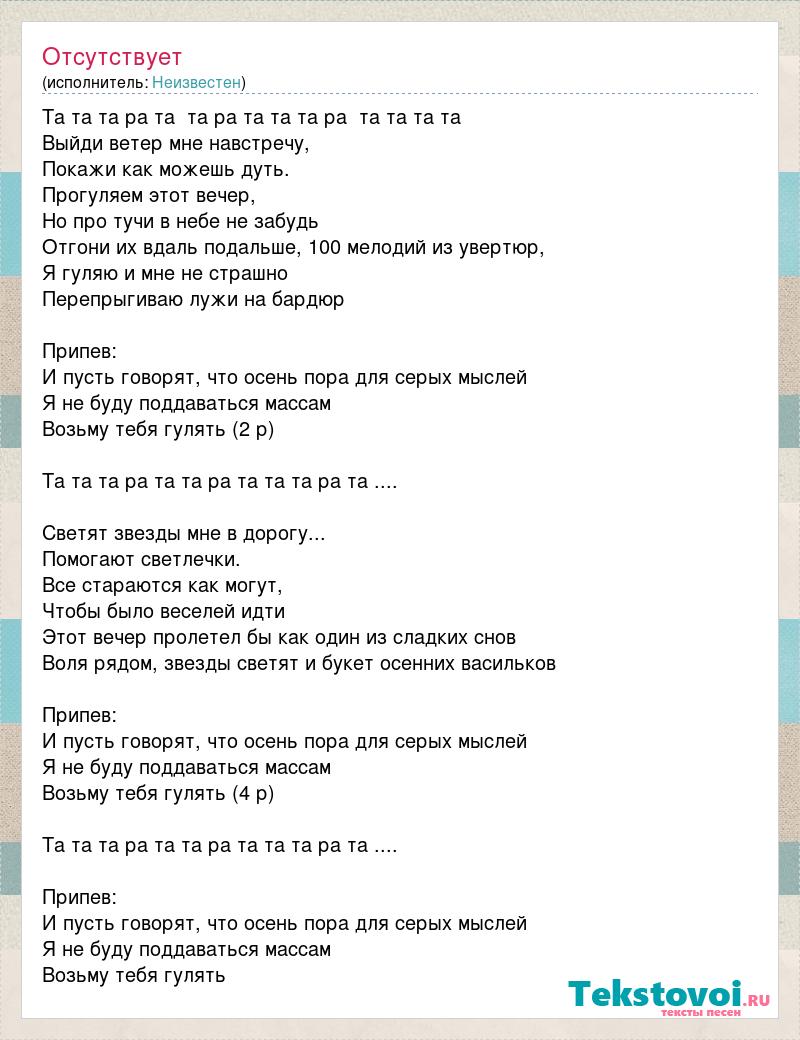 Та та та ра та та ра та та та ра та та та та Выйди ветер мне навстречу, Покажи как можешь дуть. Прогуляем этот вечер, Но про тучи в небе не забудь Отгони их вдаль подальше, 100 мелодий из увертюр, Я гуляю и мне не страшно Перепрыгиваю лужи на бардюр Припев: И пусть говорят, что осень пора для серых мыслей Я не буду поддаваться массам Возьму тебя гулять (2 р) Та та та ра та та ра та та та ра та .... Светят звезды мне в дорогу... Помогают светлечки. Все стараются как могут, Чтобы было веселей идти Этот вечер пролетел бы как один из сладких снов Воля рядом, звезды светят и букет осенних васильков Припев: И пусть говорят, что осень пора для серых мыслей Я не буду поддаваться массам Возьму тебя гулять (4 р) Та та та ра та та ра та та та ра та .... Припев: И пусть говорят, что осень пора для серых мыслей Я не буду поддаваться массам Возьму тебя гулять