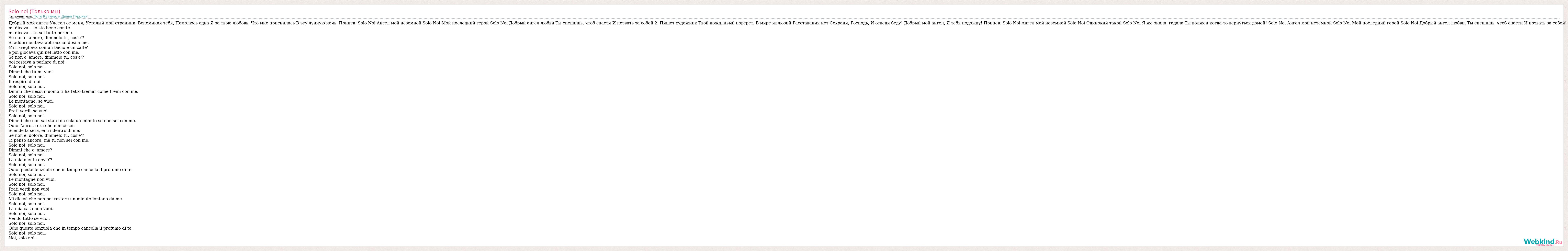 Добрый мой ангел Улетел от меня, Усталый мой странник, Вспоминая тебя, Помолюсь одна Я за твою любовь, Что мне приснилась В эту лунную ночь. Припев: Solo Noi Ангел мой неземной Solo Noi Мой последний герой Solo Noi Добрый ангел любви Ты спешишь, чтоб спасти И позвать за собой 2. Пишет художник Твой дождливый портрет, В мире иллюзий Расставания нет Сохрани, Господь, И отведи беду! Добрый мой ангел, Я тебя подожду! Припев: Solo Noi Ангел мой неземной Solo Noi Одинокий такой Solo Noi Я же знала, гадала Ты должен когда-то вернуться домой! Solo Noi Ангел мой неземной Solo Noi Мой последний герой Solo Noi Добрый ангел любви, Ты спешишь, чтоб спасти И позвать за собой! mi diceva... io sto bene con te. mi diceva... tu sei tutto per me. Se non e' amore, dimmelo tu, cos'e'? Si addormentava abbracciandosi a me. Mi risvegliava con un bacio e un caffe' e poi giocava qui nel letto con me. Se non e' amore, dimmelo tu, cos'e'? poi restava a parlare di noi. Solo noi, solo noi. Dimmi che tu mi vuoi. Solo noi, solo noi. Il respiro di noi. Solo noi, solo noi. Dimmi che nessun uomo ti ha fatto tremar come tremi con me. Solo noi, solo noi. Le montagne, se vuoi. Solo noi, solo noi. Prati verdi, se vuoi. Solo noi, solo noi. Dimmi che non sai stare da sola un minuto se non sei con me. Odio l'aurora ora che non ci sei. Scende la sera, entri dentro di me. Se non e' dolore, dimmelo tu, cos'e'? Ti penso ancora, ma tu non sei con me. Solo noi, solo noi. Dimmi che e' amore? Solo noi, solo noi. La mia mente dov'e'? Solo noi, solo noi. Odio queste lenzuola che in tempo cancella il profumo di te. Solo noi, solo noi. Le montagne non vuoi. Solo noi, solo noi. Prati verdi non vuoi. Solo noi, solo noi. Mi dicevi che non poi restare un minuto lontano da me. Solo noi, solo noi. La mia casa non vuoi. Solo noi, solo noi. Vendo tutto se vuoi. Solo noi, solo noi. Odio queste lenzuola che in tempo cancella il profumo di te. Solo noi. solo noi... Noi, solo noi...