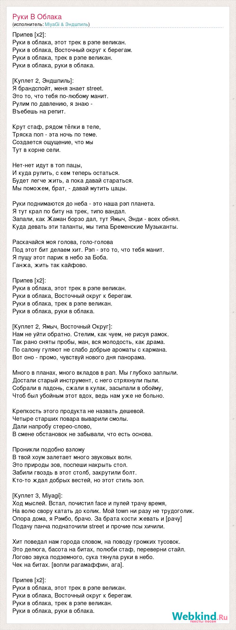 Припев [x2]: Руки в облака, этот трек в рэпе великан. Руки в облака, Восточный округ к берегам. Руки в облака, трек в рэпе великан. Руки в облака, руки в облака. [Куплет 2, Эндшпиль]: Я брандспойт, меня знает street. Это то, что тебя по-любому манит. Рулим по давлению, я знаю - Въебешь на репит. Крут стаф, рядом тёлки в теле, Тряска поп - эта ночь по теме. Создается ощущение, что мы Тут в корне сели. Нет-нет идут в топ пацы, И куда рулить, с кем теперь остаться. Будет легче жить, а пока давай стараться. Мы поможем, брат, - давай мутить цацы. Руки поднимаются до неба - это наша рэп планета. Я тут крал по биту на трек, типо вандал. Запали, как Жаман борзо дал, тут Ямыч, Энди - всех обнял. Куда девать эти таланты, мы типа Бременские Музыканты. Раскачайся моя голова, голо-голова Под этот бит делаем хит. Рэп - это то, что тебя манит. Я пущу этот парик в небо за Боба. Ганжа, жить так кайфово. Припев [x2]: Руки в облака, этот трек в рэпе великан. Руки в облака, Восточный округ к берегам. Руки в облака, трек в рэпе великан. Руки в облака, руки в облака. [Куплет 2, Ямыч, Восточный Округ]: Нам не уйти обратно. Стелим, как чуем, не рисуя рамок. Так рано сняты пробы, ман, вся молодость, как драма. По салону гуляют не слабо добрые ароматы с кармана. Вот оно - промо, чувствуй нового дня панорама. Много в планах, много вкладов в рап. Мы глубоко заплыли. Достали старый инструмент, с него стряхнули пыли. Собрали в ладонь, сжали в кулак, засыпали в обойму, Чтоб был убойным этот вдох, ведь нам уже не больно. Крепкость этого продукта не назвать дешевой. Четыре старших повара выварили смолы. Дали напробу стерео-слово, В смене обстановок не забывали, что есть основа. Проникли подобно взлому В твой хоум залетает много звуковых волн. Это природы зов, поспеши накрыть стол. Забили гвоздь в этот столб, закрутили болт. Кто-то ждал добрых вестей, но этот стиль зол. [Куплет 3, Miyagi]: Ход мыслей. Встал, почистил face и пулей трачу время, На волю свору катать до колик. Мой town ни разу не трудоголик. Опора дома, я Рэмбо, брачо. За брата кости жевать и [рачу] Подачу панча поднаточили street и прочие псы хичили. Хит поведал нам города словом, на поводу громких тусовок. Это делюга, басота на битах, полюби стаф, переверни стайл. Логово звука подземного, сука тянула руки в небо. Чек на битах. [вопли рагамаффин, ага]. Припев [x2]: Руки в облака, этот трек в рэпе великан. Руки в облака, Восточный округ к берегам. Руки в облака, трек в рэпе великан. Руки в облака, руки в облака.