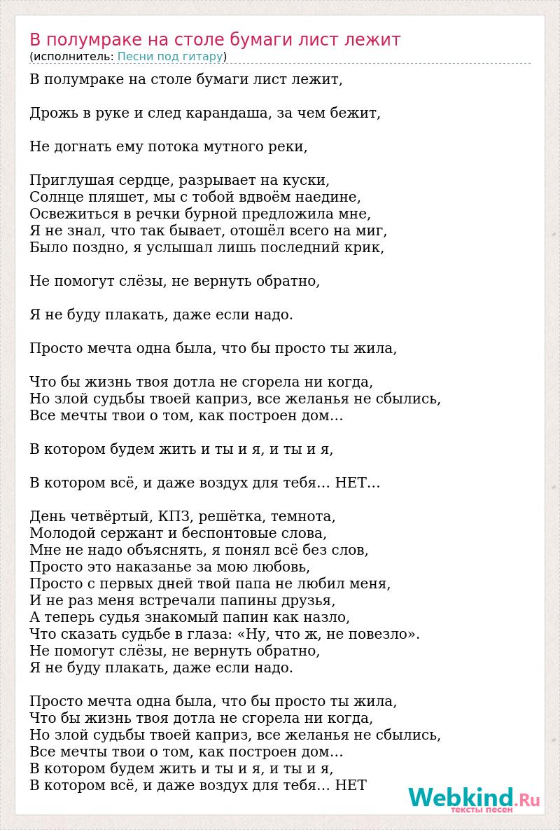 В полумраке на столе бумаги лист лежит, Дрожь в руке и след карандаша, за чем бежит, Не догнать ему потока мутного реки, Приглушая сердце, разрывает на куски, Солнце пляшет, мы с тобой вдвоём наедине, Освежиться в речки бурной предложила мне, Я не знал, что так бывает, отошёл всего на миг, Было поздно, я услышал лишь последний крик, Не помогут слёзы, не вернуть обратно, Я не буду плакать, даже если надо. Просто мечта одна была, что бы просто ты жила, Что бы жизнь твоя дотла не сгорела ни когда, Но злой судьбы твоей каприз, все желанья не сбылись, Все мечты твои о том, как построен дом… В котором будем жить и ты и я, и ты и я, В котором всё, и даже воздух для тебя… НЕТ… День четвёртый, КПЗ, решётка, темнота, Молодой сержант и беспонтовые слова, Мне не надо объяснять, я понял всё без слов, Просто это наказанье за мою любовь, Просто с первых дней твой папа не любил меня, И не раз меня встречали папины друзья, А теперь судья знакомый папин как назло, Что сказать судьбе в глаза: «Ну, что ж, не повезло». Не помогут слёзы, не вернуть обратно, Я не буду плакать, даже если надо. Просто мечта одна была, что бы просто ты жила, Что бы жизнь твоя дотла не сгорела ни когда, Но злой судьбы твоей каприз, все желанья не сбылись, Все мечты твои о том, как построен дом… В котором будем жить и ты и я, и ты и я, В котором всё, и даже воздух для тебя… НЕТ