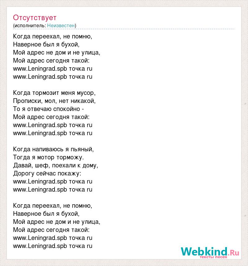 Когда переехал, не помню, Наверное был я бухой, Мой адрес не дом и не улица, Мой адрес сегодня такой: www.Leningrad.spb точка ru www.Leningrad.spb точка ru Когда тормозит меня мусор, Прописки, мол, нет никакой, То я отвечаю спокойно - Мой адрес сегодня такой: www.Leningrad.spb точка ru www.Leningrad.spb точка ru Когда напиваюсь я пьяный, Тогда я мотор торможу. Давай, шеф, поехали к дому, Дорогу сейчас покажу: www.Leningrad.spb точка ru www.Leningrad.spb точка ru Когда переехал, не помню, Наверное был я бухой, Мой адрес не дом и не улица, Мой адрес сегодня такой: www.Leningrad.spb точка ru www.Leningrad.spb точка ru