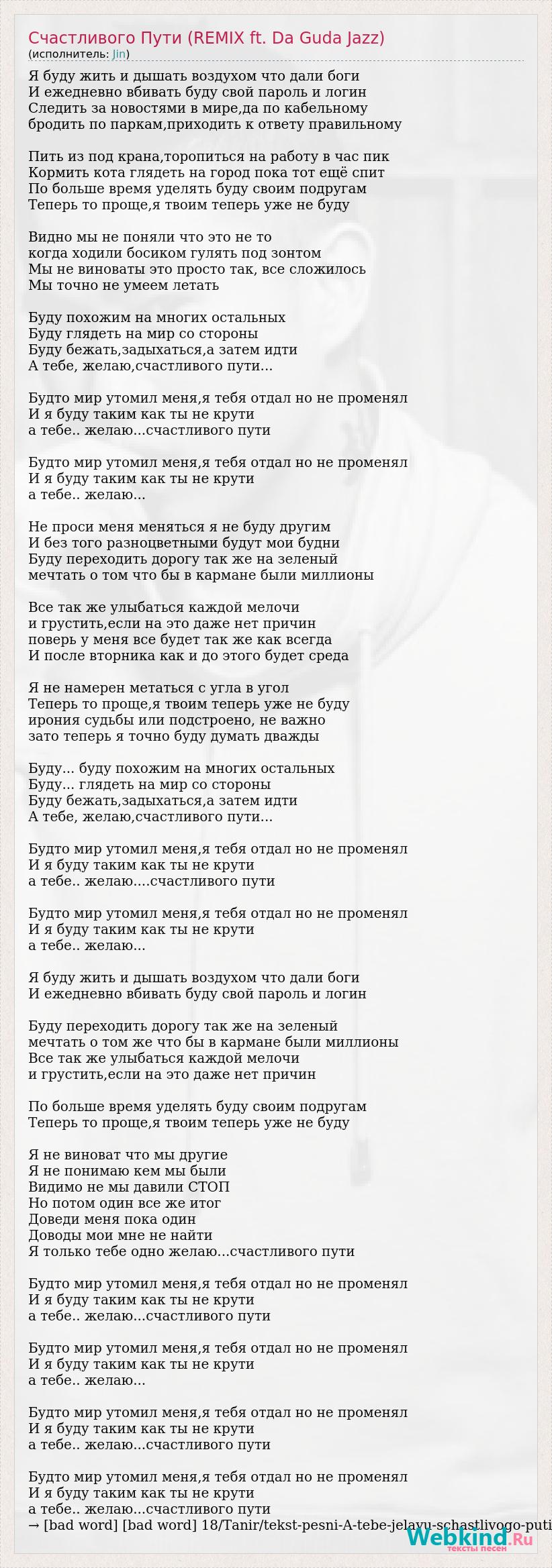 Я буду жить и дышать воздухом что дали боги И ежедневно вбивать буду свой пароль и логин Следить за новостями в мире,да по кабельному бродить по паркам,приходить к ответу правильному Пить из под крана,торопиться на работу в час пик Кормить кота глядеть на город пока тот ещё спит По больше время уделять буду своим подругам Теперь то проще,я твоим теперь уже не буду Видно мы не поняли что это не то когда ходили босиком гулять под зонтом Мы не виноваты это просто так, все сложилось Мы точно не умеем летать Буду похожим на многих остальных Буду глядеть на мир со стороны Буду бежать,задыхаться,а затем идти А тебе, желаю,счастливого пути... Будто мир утомил меня,я тебя отдал но не променял И я буду таким как ты не крути а тебе.. желаю...счастливого пути Будто мир утомил меня,я тебя отдал но не променял И я буду таким как ты не крути а тебе.. желаю... Не проси меня меняться я не буду другим И без того разноцветными будут мои будни Буду переходить дорогу так же на зеленый мечтать о том что бы в кармане были миллионы Все так же улыбаться каждой мелочи и грустить,если на это даже нет причин поверь у меня все будет так же как всегда И после вторника как и до этого будет среда Я не намерен метаться с угла в угол Теперь то проще,я твоим теперь уже не буду ирония судьбы или подстроено, не важно зато теперь я точно буду думать дважды Буду... буду похожим на многих остальных Буду... глядеть на мир со стороны Буду бежать,задыхаться,а затем идти А тебе, желаю,счастливого пути... Будто мир утомил меня,я тебя отдал но не променял И я буду таким как ты не крути а тебе.. желаю....счастливого пути Будто мир утомил меня,я тебя отдал но не променял И я буду таким как ты не крути а тебе.. желаю... Я буду жить и дышать воздухом что дали боги И ежедневно вбивать буду свой пароль и логин Буду переходить дорогу так же на зеленый мечтать о том же что бы в кармане были миллионы Все так же улыбаться каждой мелочи и грустить,если на это даже нет причин По больше время уделять буду своим подругам Теперь то проще,я твоим теперь уже не буду Я не виноват что мы другие Я не понимаю кем мы были Видимо не мы давили СТОП Но потом один все же итог Доведи меня пока один Доводы мои мне не найти Я только тебе одно желаю...счастливого пути Будто мир утомил меня,я тебя отдал но не променял И я буду таким как ты не крути а тебе.. желаю...счастливого пути Будто мир утомил меня,я тебя отдал но не променял И я буду таким как ты не крути а тебе.. желаю... Будто мир утомил меня,я тебя отдал но не променял И я буду таким как ты не крути а тебе.. желаю...счастливого пути Будто мир утомил меня,я тебя отдал но не променял И я буду таким как ты не крути а тебе.. желаю...счастливого пути → [bad word] [bad word] 18/Tanir/tekst-pesni-A-tebe-jelayu-schastlivogo-puti