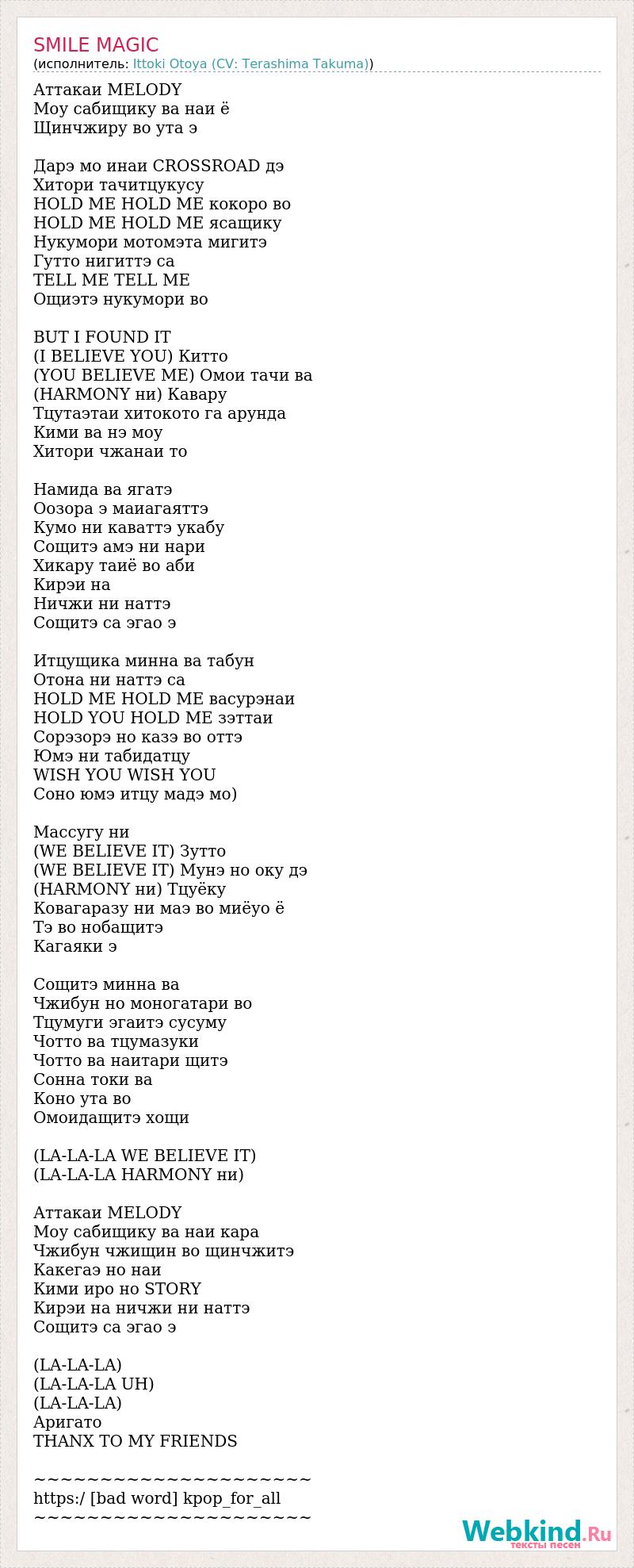 Аттакаи MELODY Моу сабищику ва наи ё Щинчжиру во ута э Дарэ мо инаи CROSSROAD дэ Хитори тачитцукусу HOLD ME HOLD ME кокоро во HOLD ME HOLD ME ясащику Нукумори мотомэта мигитэ Гутто нигиттэ са TELL ME TELL ME Ощиэтэ нукумори во BUT I FOUND IT (I BELIEVE YOU) Китто (YOU BELIEVE ME) Омои тачи ва (HARMONY ни) Кавару Тцутаэтаи хитокото га арунда Кими ва нэ моу Хитори чжанаи то Намида ва ягатэ Оозора э маиагаяттэ Кумо ни каваттэ укабу Сощитэ амэ ни нари Хикару таиё во аби Кирэи на Ничжи ни наттэ Сощитэ са эгао э Итцущика минна ва табун Отона ни наттэ са HOLD ME HOLD ME васурэнаи HOLD YOU HOLD ME зэттаи Сорэзорэ но казэ во оттэ Юмэ ни табидатцу WISH YOU WISH YOU Соно юмэ итцу мадэ мо) Массугу ни (WE BELIEVE IT) Зутто (WE BELIEVE IT) Мунэ но оку дэ (HARMONY ни) Тцуёку Ковагаразу ни маэ во миёуо ё Тэ во нобащитэ Кагаяки э Сощитэ минна ва Чжибун но моногатари во Тцумуги эгаитэ сусуму Чотто ва тцумазуки Чотто ва наитари щитэ Сонна токи ва Коно ута во Омоидащитэ хощи (LA-LA-LA WE BELIEVE IT) (LA-LA-LA HARMONY ни) Аттакаи MELODY Моу сабищику ва наи кара Чжибун чжищин во щинчжитэ Какегаэ но наи Кими иро но STORY Кирэи на ничжи ни наттэ Сощитэ са эгао э (LA-LA-LA) (LA-LA-LA UH) (LA-LA-LA) Аригато THANX TO MY FRIENDS ~~~~~~~~~~~~~~~~~~~~~ https:/ [bad word] kpop_for_all ~~~~~~~~~~~~~~~~~~~~~