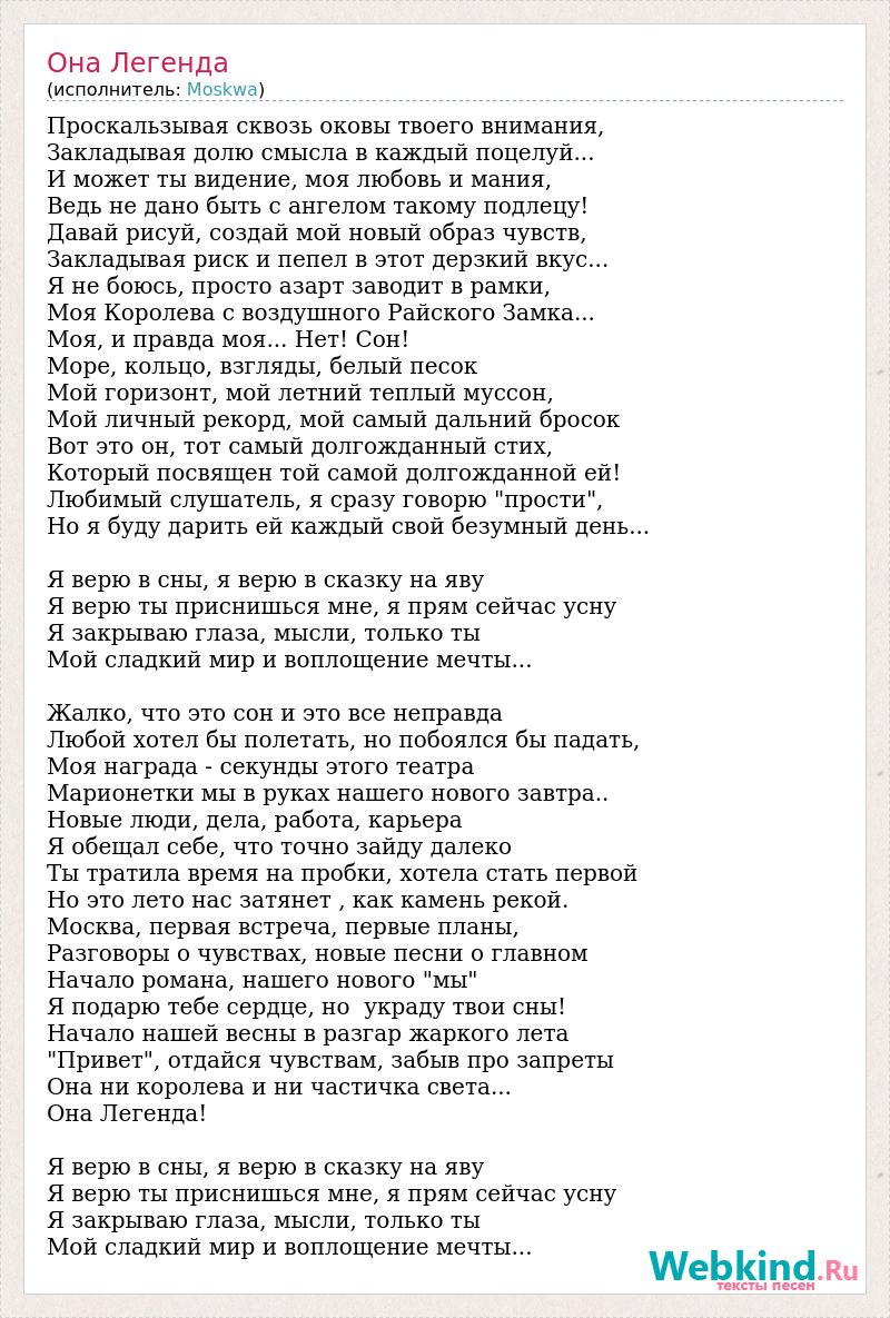 Проскальзывая сквозь оковы твоего внимания, Закладывая долю смысла в каждый поцелуй... И может ты видение, моя любовь и мания, Ведь не дано быть с ангелом такому подлецу! Давай рисуй, создай мой новый образ чувств, Закладывая риск и пепел в этот дерзкий вкус... Я не боюсь, просто азарт заводит в рамки, Моя Королева с воздушного Райского Замка... Моя, и правда моя... Нет! Сон! Море, кольцо, взгляды, белый песок Мой горизонт, мой летний теплый муссон, Мой личный рекорд, мой самый дальний бросок Вот это он, тот самый долгожданный стих, Который посвящен той самой долгожданной ей! Любимый слушатель, я сразу говорю "прости", Но я буду дарить ей каждый свой безумный день... Я верю в сны, я верю в сказку на яву Я верю ты приснишься мне, я прям сейчас усну Я закрываю глаза, мысли, только ты Мой сладкий мир и воплощение мечты... Жалко, что это сон и это все неправда Любой хотел бы полетать, но побоялся бы падать, Моя награда - секунды этого театра Марионетки мы в руках нашего нового завтра.. Новые люди, дела, работа, карьера Я обещал себе, что точно зайду далеко Ты тратила время на пробки, хотела стать первой Но это лето нас затянет , как камень рекой. Москва, первая встреча, первые планы, Разговоры о чувствах, новые песни о главном Начало романа, нашего нового "мы" Я подарю тебе сердце, но украду твои сны! Начало нашей весны в разгар жаркого лета "Привет", отдайся чувствам, забыв про запреты Она ни королева и ни частичка света... Она Легенда! Я верю в сны, я верю в сказку на яву Я верю ты приснишься мне, я прям сейчас усну Я закрываю глаза, мысли, только ты Мой сладкий мир и воплощение мечты...