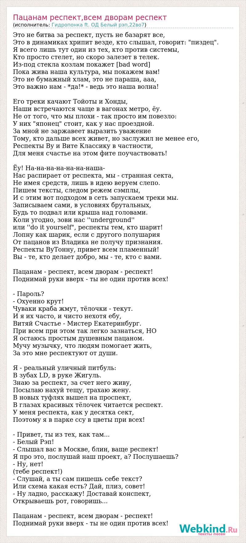 Это не битва за респект, пусть не базарят все, Это в динамиках хрипит везде, кто слышал, говорит: "пиздец". Я всего лишь тут один из тех, кто против системы, Кто просто стелет, но скоро залезет в телек. Из-под стекла козлам покажет [bad word] Пока жива наша культура, мы покажем вам! Это не бумажный хлам, это не параша, ааа, Это важно нам - *да!* - ведь это наша волна! Его треки качают Тойоты и Хонды, Наши встречаются чаще в вагонах метро, ёу. Не от того, что мы плохи - так просто им повезло: У них "японец" стоит, как у нас проездной. За мной не заржавеет выразить уважение Тому, кто дальше всех живет, но заслужил не менее его, Респекты Ву и Вите Классику в частности, Для меня счастье на этом фите поучаствовать! Ёу! На-на-на-на-на-на-наша- Нас распирает от респекта, мы - странная секта, Не имея средств, лишь в идею веруем слепо. Пишем тексты, следом режем сэмплы, И с этим вот подходом в сеть запускаем треки мы. Записываем сами, в условиях брутальных, Будь то подвал или крыша над головами. Коли угодно, зови нас ''underground'' или ''do it yourself", респекты тем, кто шарит! Лопну как шарик, если с другого полушария От пацанов из Владика не получу признания. Респекты ВуТонну, привет всем пламенный! Вы - те, кто делает добро, мы - те, кто с вами. Пацанам - респект, всем дворам - респект! Поднимай руки вверх - ты не один против всех! - Пароль? - Охуенно крут! Чуваки краба жмут, тёлочки - текут. И я их часто, и чисто нехотя ебу, Витяй Счастье - Мистер Екатеринбург. При всем при этом так легко зазнаться, НО Я остаюсь простым душевным пацаном. Мучу музычку, что людям помогает жить, За это мне респектуют от души. Я - реальный уличный питбуль: В зубах LD, в руке Жигуль. Знаю за респект, за счет него живу, Посылаю нахуй тещу, трахаю жену. В новых туфлях вышел на проспект, В глазах красивых тёлочек читается респект. У меня респекта, как у десятка сект, Поэтому я в парке ссу в цветы при всех! - Привет, ты из тех, как там... - Белый Рэп! - Слышал вас в Москве, блин, ваще респект! Я про это, послушай наш проект, а? Послушаешь? - Ну, нет! (тебе респект!) - Слушай, а ты сам пишешь себе текст? Или схема какая есть? Дай, плиз, совет! - Ну ладно, расскажу! Доставай конспект, Открываешь рот, говоришь... Пацанам - респект, всем дворам - респект! Поднимай руки вверх - ты не один против всех!