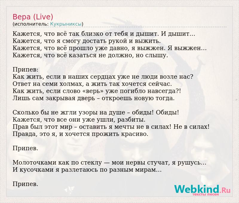 Кажется, что всё так близко от тебя и дышит. И дышит… Кажется, что я смогу достать рукой и выжить. Кажется, что всё прошло уже давно, я выжжен. Я выжжен… Кажется, что всё казаться не должно, но слышу. Припев: Как жить, если в наших сердцах уже не люди возле нас? Ответ на семи холмах, а жить так хочется сейчас. Как жить, если слово «верь» уже погибло навсегда?! Лишь сам закрывая дверь – откроешь новую тогда. Сколько бы не жгли узоры на душе – обиды! Обиды! Кажется, что все они уже ушли, разбиты. Прав был этот мир – оставить я мечты не в силах! Не в силах! Правда, это я, и хочется прожить красиво. Припев. Молоточками как по стеклу — мои нервы стучат, я рушусь… И кусочками я разлетаюсь по разным мирам… Припев.