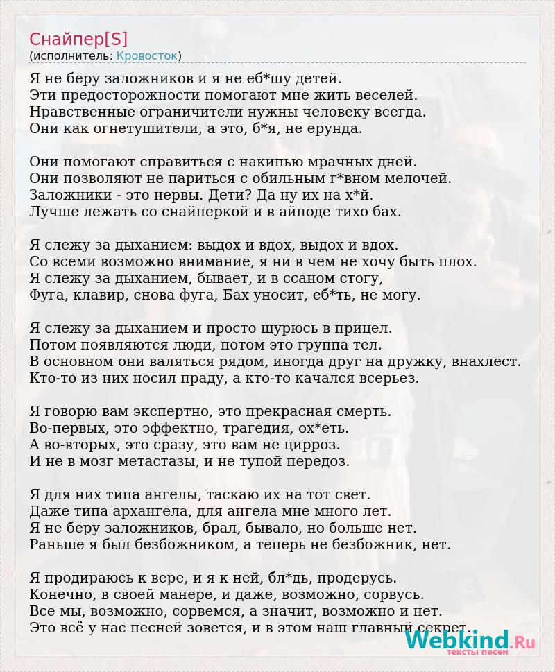 Я не беру заложников и я не еб*шу детей. Эти предосторожности помогают мне жить веселей. Нравственные ограничители нужны человеку всегда. Они как огнетушители, а это, б*я, не ерунда. Они помогают справиться с накипью мрачных дней. Они позволяют не париться с обильным г*вном мелочей. Заложники - это нервы. Дети? Да ну их на х*й. Лучше лежать со снайперкой и в айподе тихо бах. Я слежу за дыханием: выдох и вдох, выдох и вдох. Со всеми возможно внимание, я ни в чем не хочу быть плох. Я слежу за дыханием, бывает, и в ссаном стогу, Фуга, клавир, снова фуга, Бах уносит, еб*ть, не могу. Я слежу за дыханием и просто щурюсь в прицел. Потом появляются люди, потом это группа тел. В основном они валяться рядом, иногда друг на дружку, внахлест. Кто-то из них носил праду, а кто-то качался всерьез. Я говорю вам экспертно, это прекрасная смерть. Во-первых, это эффектно, трагедия, ох*еть. А во-вторых, это сразу, это вам не цирроз. И не в мозг метастазы, и не тупой передоз. Я для них типа ангелы, таскаю их на тот свет. Даже типа архангела, для ангела мне много лет. Я не беру заложников, брал, бывало, но больше нет. Раньше я был безбожником, а теперь не безбожник, нет. Я продираюсь к вере, и я к ней, бл*дь, продерусь. Конечно, в своей манере, и даже, возможно, сорвусь. Все мы, возможно, сорвемся, а значит, возможно и нет. Это всё у нас песней зовется, и в этом наш главный секрет.