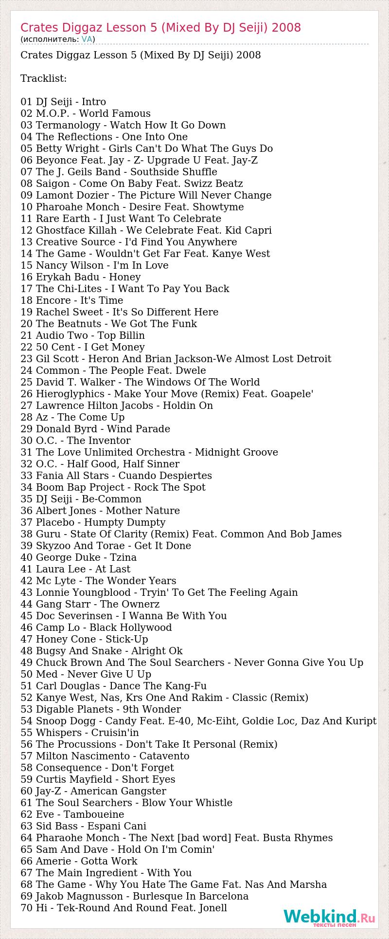 Crates Diggaz Lesson 5 (Mixed By DJ Seiji) 2008 Tracklist: 01 DJ Seiji - Intro 02 M.O.P. - World Famous 03 Termanology - Watch How It Go Down 04 The Reflections - One Into One 05 Betty Wright - Girls Can't Do What The Guys Do 06 Beyonce Feat. Jay - Z- Upgrade U Feat. Jay-Z 07 The J. Geils Band - Southside Shuffle 08 Saigon - Come On Baby Feat. Swizz Beatz 09 Lamont Dozier - The Picture Will Never Change 10 Pharoahe Monch - Desire Feat. Showtyme 11 Rare Earth - I Just Want To Celebrate 12 Ghostface Killah - We Celebrate Feat. Kid Capri 13 Creative Source - I'd Find You Anywhere 14 The Game - Wouldn't Get Far Feat. Kanye West 15 Nancy Wilson - I'm In Love 16 Erykah Badu - Honey 17 The Chi-Lites - I Want To Pay You Back 18 Encore - It's Time 19 Rachel Sweet - It's So Different Here 20 The Beatnuts - We Got The Funk 21 Audio Two - Top Billin 22 50 Cent - I Get Money 23 Gil Scott - Heron And Brian Jackson-We Almost Lost Detroit 24 Common - The People Feat. Dwele 25 David T. Walker - The Windows Of The World 26 Hieroglyphics - Make Your Move (Remix) Feat. Goapele' 27 Lawrence Hilton Jacobs - Holdin On 28 Az - The Come Up 29 Donald Byrd - Wind Parade 30 O.C. - The Inventor 31 The Love Unlimited Orchestra - Midnight Groove 32 O.C. - Half Good, Half Sinner 33 Fania All Stars - Cuando Despiertes 34 Boom Bap Project - Rock The Spot 35 DJ Seiji - Be-Common 36 Albert Jones - Mother Nature 37 Placebo - Humpty Dumpty 38 Guru - State Of Clarity (Remix) Feat. Common And Bob James 39 Skyzoo And Torae - Get It Done 40 George Duke - Tzina 41 Laura Lee - At Last 42 Mc Lyte - The Wonder Years 43 Lonnie Youngblood - Tryin' To Get The Feeling Again 44 Gang Starr - The Ownerz 45 Doc Severinsen - I Wanna Be With You 46 Camp Lo - Black Hollywood 47 Honey Cone - Stick-Up 48 Bugsy And Snake - Alright Ok 49 Chuck Brown And The Soul Searchers - Never Gonna Give You Up 50 Med - Never Give U Up 51 Carl Douglas - Dance The Kang-Fu 52 Kanye West, Nas, Krs One And Rakim - Classic (Remix) 53 Digable Planets - 9th Wonder 54 Snoop Dogg - Candy Feat. E-40, Mc-Eiht, Goldie Loc, Daz And Kuript 55 Whispers - Cruisin'in 56 The Procussions - Don't Take It Personal (Remix) 57 Milton Nascimento - Catavento 58 Consequence - Don't Forget 59 Curtis Mayfield - Short Eyes 60 Jay-Z - American Gangster 61 The Soul Searchers - Blow Your Whistle 62 Eve - Tamboueine 63 Sid Bass - Espani Cani 64 Pharaohe Monch - The Next [bad word] Feat. Busta Rhymes 65 Sam And Dave - Hold On I'm Comin' 66 Amerie - Gotta Work 67 The Main Ingredient - With You 68 The Game - Why You Hate The Game Fat. Nas And Marsha 69 Jakob Magnusson - Burlesque In Barcelona 70 Hi - Tek-Round And Round Feat. Jonell