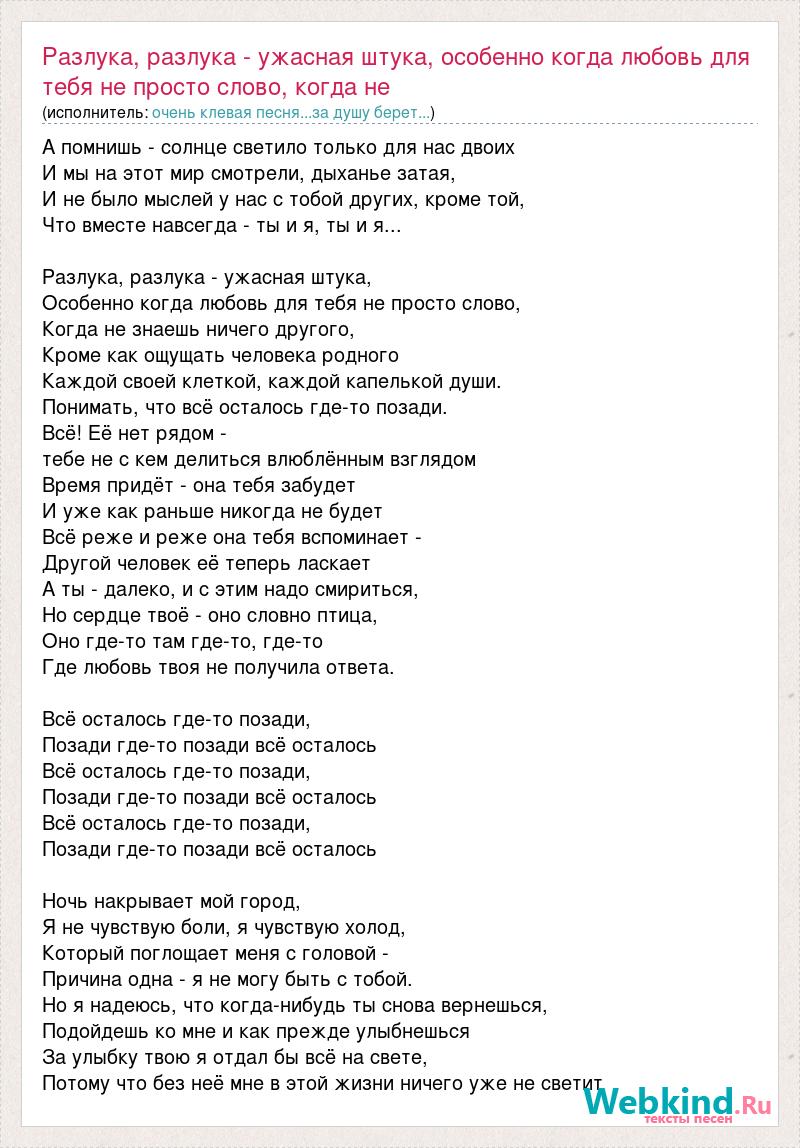 А помнишь - солнце светило только для нас двоих И мы на этот мир смотрели, дыханье затая, И не было мыслей у нас с тобой других, кроме той, Что вместе навсегда - ты и я, ты и я... Разлука, разлука - ужасная штука, Особенно когда любовь для тебя не просто слово, Когда не знаешь ничего другого, Кроме как ощущать человека родного Каждой своей клеткой, каждой капелькой души. Понимать, что всё осталось где-то позади. Всё! Её нет рядом - тебе не с кем делиться влюблённым взглядом Время придёт - она тебя забудет И уже как раньше никогда не будет Всё реже и реже она тебя вспоминает - Другой человек её теперь ласкает А ты - далеко, и с этим надо смириться, Но сердце твоё - оно словно птица, Оно где-то там где-то, где-то Где любовь твоя не получила ответа. Всё осталось где-то позади, Позади где-то позади всё осталось Всё осталось где-то позади, Позади где-то позади всё осталось Всё осталось где-то позади, Позади где-то позади всё осталось Ночь накрывает мой город, Я не чувствую боли, я чувствую холод, Который поглощает меня с головой - Причина одна - я не могу быть с тобой. Но я надеюсь, что когда-нибудь ты снова вернешься, Подойдешь ко мне и как прежде улыбнешься За улыбку твою я отдал бы всё на свете, Потому что без неё мне в этой жизни ничего уже не светит