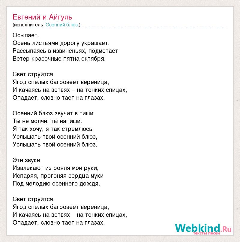 Осыпает. Осень листьями дорогу украшает. Рассыпаясь в извиненьях, подметает Ветер красочные пятна октября. Свет струится. Ягод спелых багровеет вереница, И качаясь на ветвях – на тонких спицах, Опадает, словно тает на глазах. Осенний блюз звучит в тиши. Ты не молчи, ты напиши. Я так хочу, я так стремлюсь Услышать твой осенний блюз, Услышать твой осенний блюз. Эти звуки Извлекают из рояля мои руки, Испаряя, прогоняя сердца муки Под мелодию осеннего дождя. Свет струится. Ягод спелых багровеет вереница, И качаясь на ветвях – на тонких спицах, Опадает, словно тает на глазах.