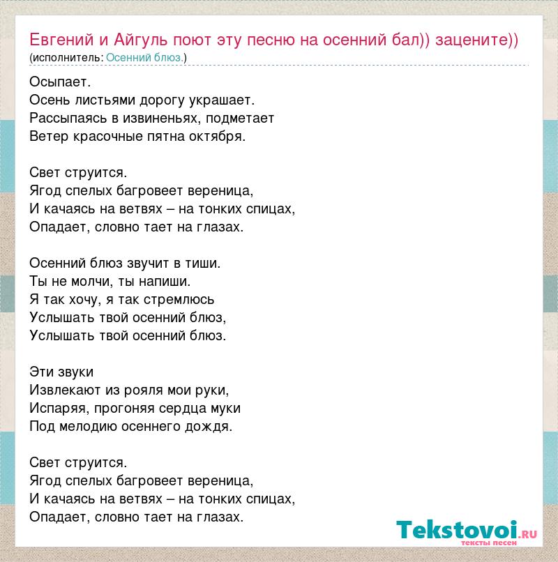 А как ты думаешь, о чем песня "Евгений и Айгуль поют эту песню на осенний бал)) зацените))" ?