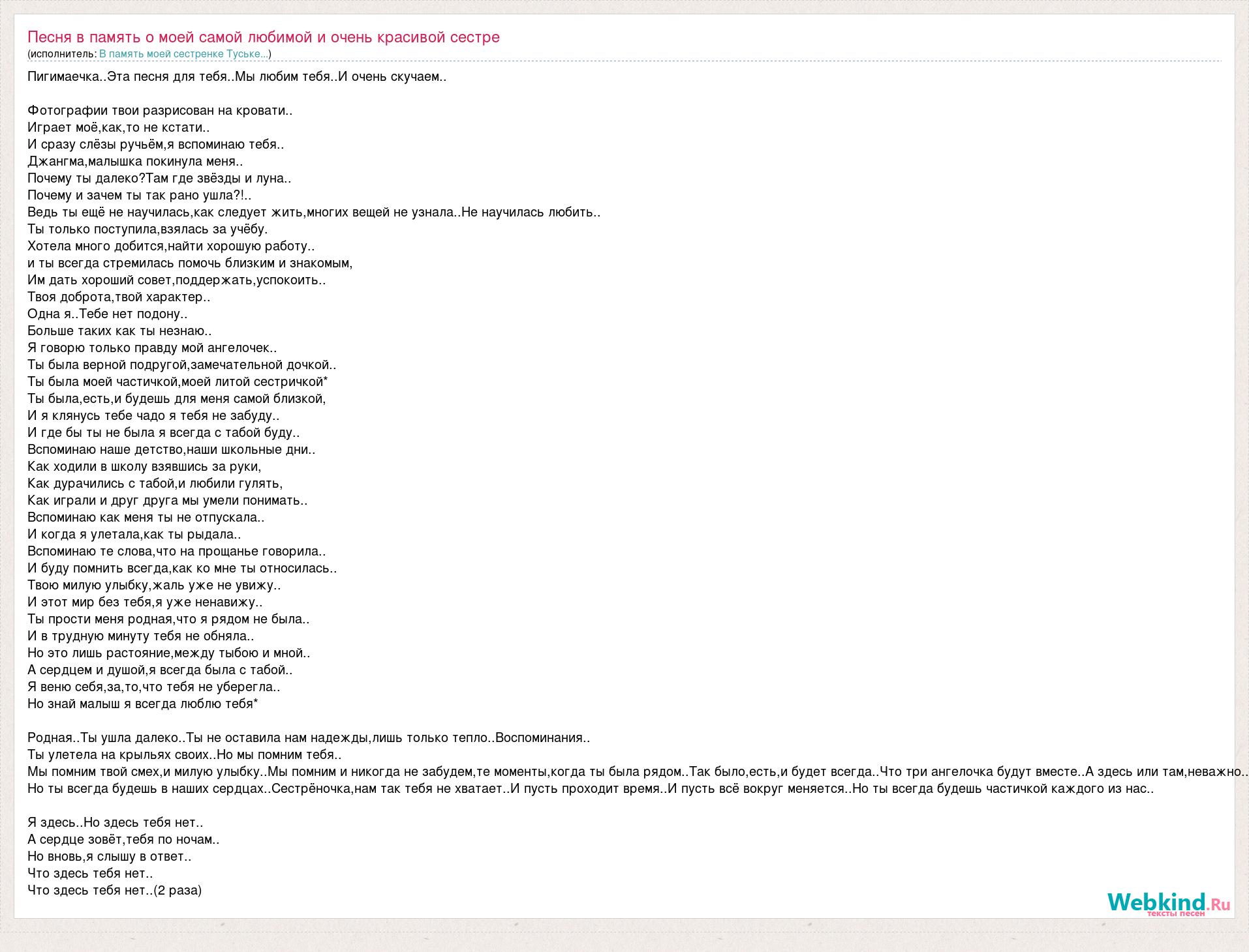 Пигимаечка..Эта песня для тебя..Мы любим тебя..И очень скучаем.. Фотографии твои разрисован на кровати.. Играет моё,как,то не кстати.. И сразу слёзы ручьём,я вспоминаю тебя.. Джангма,малышка покинула меня.. Почему ты далеко?Там где звёзды и луна.. Почему и зачем ты так рано ушла?!.. Ведь ты ещё не научилась,как следует жить,многих вещей не узнала..Не научилась любить.. Ты только поступила,взялась за учёбу. Хотела много добится,найти хорошую работу.. и ты всегда стремилась помочь близким и знакомым, Им дать хороший совет,поддержать,успокоить.. Твоя доброта,твой характер.. Одна я..Тебе нет подону.. Больше таких как ты незнаю.. Я говорю только правду мой ангелочек.. Ты была верной подругой,замечательной дочкой.. Ты была моей частичкой,моей литой сестричкой* Ты была,есть,и будешь для меня самой близкой, И я клянусь тебе чадо я тебя не забуду.. И где бы ты не была я всегда с табой буду.. Вспоминаю наше детство,наши школьные дни.. Как ходили в школу взявшись за руки, Как дурачились с табой,и любили гулять, Как играли и друг друга мы умели понимать.. Вспоминаю как меня ты не отпускала.. И когда я улетала,как ты рыдала.. Вспоминаю те слова,что на прощанье говорила.. И буду помнить всегда,как ко мне ты относилась.. Твою милую улыбку,жаль уже не увижу.. И этот мир без тебя,я уже ненавижу.. Ты прости меня родная,что я рядом не была.. И в трудную минуту тебя не обняла.. Но это лишь растояние,между тыбою и мной.. А сердцем и душой,я всегда была с табой.. Я веню себя,за,то,что тебя не уберегла.. Но знай малыш я всегда люблю тебя* Родная..Ты ушла далеко..Ты не оставила нам надежды,лишь только тепло..Воспоминания.. Ты улетела на крыльях своих..Но мы помним тебя.. Мы помним твой смех,и милую улыбку..Мы помним и никогда не забудем,те моменты,когда ты была рядом..Так было,есть,и будет всегда..Что три ангелочка будут вместе..А здесь или там,неважно.. Но ты всегда будешь в наших сердцах..Сестрёночка,нам так тебя не хватает..И пусть проходит время..И пусть всё вокруг меняется..Но ты всегда будешь частичкой каждого из нас.. Я здесь..Но здесь тебя нет.. А сердце зовёт,тебя по ночам.. Но вновь,я слышу в ответ.. Что здесь тебя нет.. Что здесь тебя нет..(2 раза)