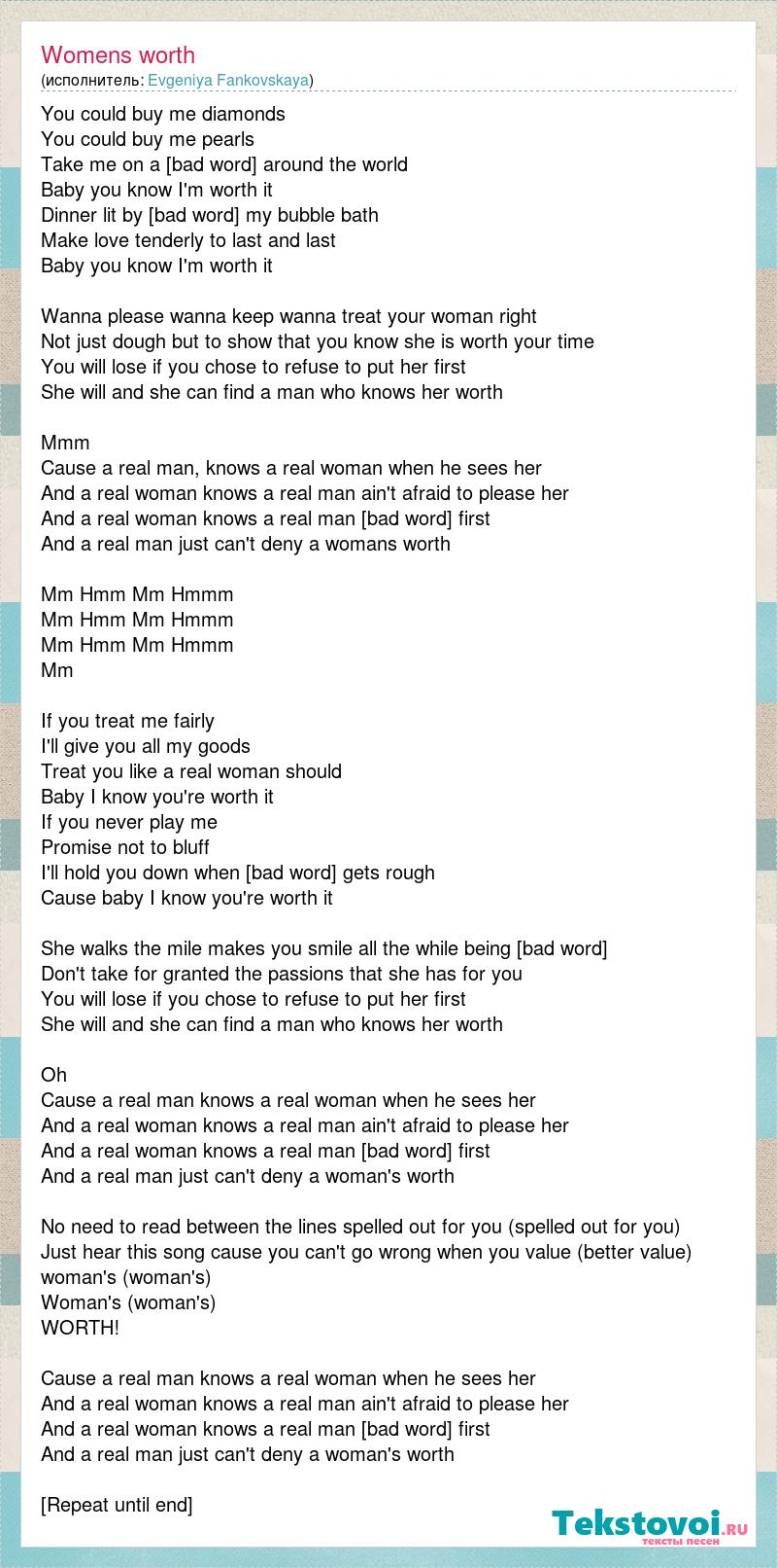 You could buy me diamonds You could buy me pearls Take me on a cruise around the world Baby you know I'm worth it Dinner lit by candles Run my bubble bath Make love tenderly to last and last Baby you know I'm worth it Wanna please wanna keep wanna treat your woman right Not just dough but to show that you know she is worth your time You will lose if you chose to refuse to put her first She will and she can find a man who knows her worth Mmm Cause a real man, knows a real woman when he sees her And a real woman knows a real man ain't afraid to please her And a real woman knows a real man always comes first And a real man just can't deny a womans worth Mm Hmm Mm Hmmm Mm Hmm Mm Hmmm Mm Hmm Mm Hmmm Mm If you treat me fairly I'll give you all my goods Treat you like a real woman should Baby I know you're worth it If you never play me Promise not to bluff I'll hold you down when [bad word] gets rough Cause baby I know you're worth it She walks the mile makes you smile all the while being true Don't take for granted the passions that she has for you You will lose if you chose to refuse to put her first She will and she can find a man who knows her worth Oh Cause a real man knows a real woman when he sees her And a real woman knows a real man ain't afraid to please her And a real woman knows a real man always comes first And a real man just can't deny a woman's worth No need to read between the lines spelled out for you (spelled out for you) Just hear this song cause you can't go wrong when you value (better value) woman's (woman's) Woman's (woman's) WORTH! Cause a real man knows a real woman when he sees her And a real woman knows a real man ain't afraid to please her And a real woman knows a real man always comes first And a real man just can't deny a woman's worth [Repeat until end]