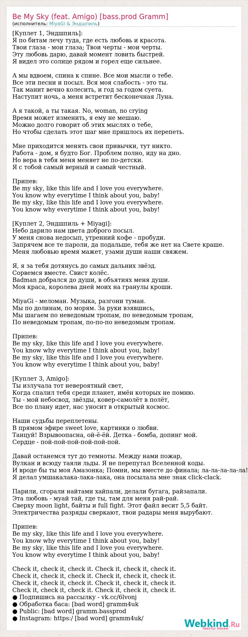 [Куплет 1, Эндшпиль]: Я по битам лечу туда, где есть любовь и красота. Твои глаза - мои глаза; Твои черты - мои черты. Эту любовь дарю, давай момент ловить быстрей. Я видел это солнце рядом и горел еще сильнее. А мы вдвоем, спина к спине. Все мои мысли о тебе. Все эти песни и посыл. Вся моя слабость - это ты. Так манит вечно колесить, и год за годом суета. Наступит ночь, а меня встретит бесконечная Луна. А я такой, а ты такая. No, woman, no crying Время может изменить, я ему не мешаю. Можно долго говорит об этих мыслях о тебе, Но чтобы сделать этот шаг мне пришлось их перепеть. Мне приходится менять свои привычки, тут никто. Работа - дом, я будто Бог. Проблем полно, иду на дно. Но вера в тебя меня меняет не по-детски. Я с тобой самый верный и самый честный. Припев: Be my sky, like this life and I love you everywhere. You know why everytime I think about you, baby! Be my sky, like this life and I love you everywhere. You know why everytime I think about you, baby! [Куплет 2, Эндшпиль + Miyagi]: Небо дарило нам цвета доброго посыл. У меня снова недосып, утренний кофе - пробуди. Запрячем все те пароли, да подальше, тебя же нет на Свете краше. Меня любовью время мажет, узами души наши свяжем. Я, я за тебя дотянусь до самых дальних звёзд. Сорвемся вместе. Свист колёс. Badman добрался до души, в объятиях меня души. Моя краса, королева дней моих на гранулы кроши. MiyaGi - меломан. Музыка, разгони туман. Мы по долинам, по морям. За руки взявшись, Мы шагаем по неведомым тропам, по неведомым тропам, По неведомым тропам, по-по-по неведомым тропам. Припев: Be my sky, like this life and I love you everywhere. You know why everytime I think about you, baby! Be my sky, like this life and I love you everywhere. You know why everytime I think about you, baby! [Куплет 3, Amigo]: Ты излучала тот невероятный свет, Когда спалил тебя среди планет, имён которых не помню. Ты - мой небосвод, звёзды, ковер-самолёт в полёт, Все по плану идет, нас уносит в открытый космос. Наши судьбы переплетены. В прямом эфире sweet love, картинки о любви. Танцуй! Взрывоопасна, ой-ё-ёй. Детка - бомба, допинг мой. Сердце - пой-пой-пой-пой-пой-пой. Давай останемся тут до темноты. Между нами пожар, Вулкан и всюду таяли льды. Я не перепутал Вселенной коды. И вроде бы ты моя Амазонка; Помни, мы вместе до финала; ла-ла-ла-ла-ла! Я делал умшакалака-лака-лака, она посылала мне знак click-clack. Парили, сгорали найтами хайпали, делали бугага, райзапали. Эта любовь - муай тай, где ты, там для меня рай-рай. Сверху moon light, байты и full fight. Этот файл весит 5,5 байт. Электричества разряды сверкают, твои радары меня вырубают. Припев: Be my sky, like this life and I love you everywhere. You know why everytime I think about you, baby! Be my sky, like this life and I love you everywhere. You know why everytime I think about you, baby! Check it, check it, check it. Check it, check it, check it. Check it, check it, check it. Check it, check it, check it. Check it, check it, check it. Check it, check it, check it. Check it, check it, check it. Check it, check it, check it. ● Подпишись на рассылку - vk.cc/6lvonj ● Обработка баса: [bad word] gramm4uk ● Public: [bad word] gramm.bassprod ● Instagram: https:/ [bad word] gramm4uk/