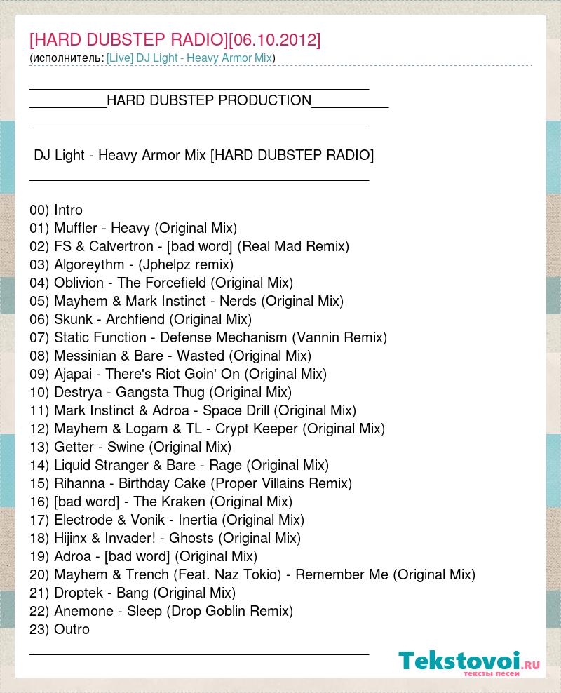 ____________________________________________ __________HARD DUBSTEP PRODUCTION__________ ____________________________________________ DJ Light - Heavy Armor Mix [HARD DUBSTEP RADIO] ____________________________________________ 00) Intro 01) Muffler - Heavy (Original Mix) 02) FS & Calvertron - [bad word] (Real Mad Remix) 03) Algoreythm - (Jphelpz remix) 04) Oblivion - The Forcefield (Original Mix) 05) Mayhem & Mark Instinct - Nerds (Original Mix) 06) Skunk - Archfiend (Original Mix) 07) Static Function - Defense Mechanism (Vannin Remix) 08) Messinian & Bare - Wasted (Original Mix) 09) Ajapai - There's Riot Goin' On (Original Mix) 10) Destrya - Gangsta Thug (Original Mix) 11) Mark Instinct & Adroa - Space Drill (Original Mix) 12) Mayhem & Logam & TL - Crypt Keeper (Original Mix) 13) Getter - Swine (Original Mix) 14) Liquid Stranger & Bare - Rage (Original Mix) 15) Rihanna - Birthday Cake (Proper Villains Remix) 16) [bad word] - The Kraken (Original Mix) 17) Electrode & Vonik - Inertia (Original Mix) 18) Hijinx & Invader! - Ghosts (Original Mix) 19) Adroa - [bad word] (Original Mix) 20) Mayhem & Trench (Feat. Naz Tokio) - Remember Me (Original Mix) 21) Droptek - Bang (Original Mix) 22) Anemone - Sleep (Drop Goblin Remix) 23) Outro ____________________________________________