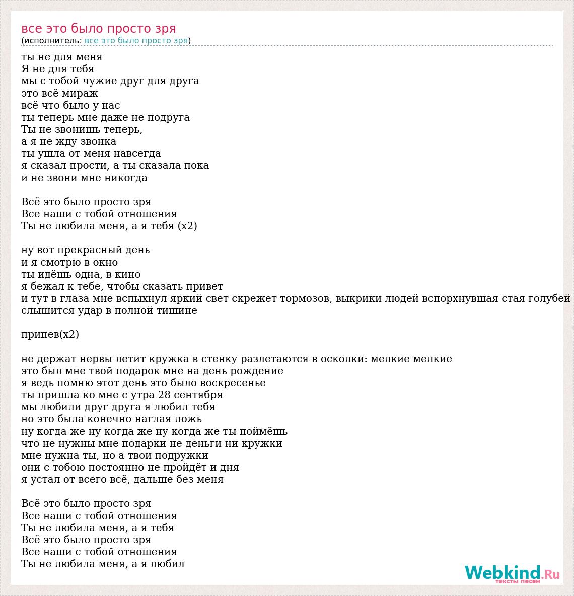 ты не для меня Я не для тебя мы с тобой чужие друг для друга это всё мираж всё что было у нас ты теперь мне даже не подруга Ты не звонишь теперь, а я не жду звонка ты ушла от меня навсегда я сказал прости, а ты сказала пока и не звони мне никогда Всё это было просто зря Все наши с тобой отношения Ты не любила меня, а я тебя (х2) ну вот прекрасный день и я смотрю в окно ты идёшь одна, в кино я бежал к тебе, чтобы сказать привет и тут в глаза мне вспыхнул яркий свет скрежет тормозов, выкрики людей вспорхнувшая стая голубей слышится удар в полной тишине припев(х2) не держат нервы летит кружка в стенку разлетаются в осколки: мелкие мелкие это был мне твой подарок мне на день рождение я ведь помню этот день это было воскресенье ты пришла ко мне с утра 28 сентября мы любили друг друга я любил тебя но это была конечно наглая ложь ну когда же ну когда же ну когда же ты поймёшь что не нужны мне подарки не деньги ни кружки мне нужна ты, но а твои подружки они с тобою постоянно не пройдёт и дня я устал от всего всё, дальше без меня Всё это было просто зря Все наши с тобой отношения Ты не любила меня, а я тебя Всё это было просто зря Все наши с тобой отношения Ты не любила меня, а я любил