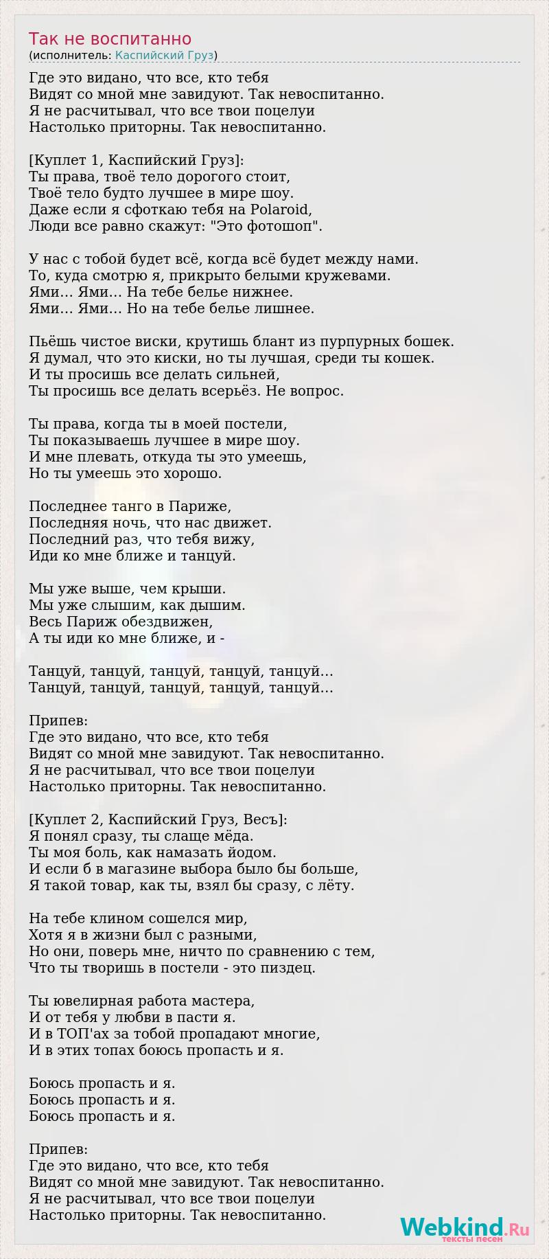 Где это видано, что все, кто тебя Видят со мной мне завидуют. Так невоспитанно. Я не расчитывал, что все твои поцелуи Настолько приторны. Так невоспитанно. [Куплет 1, Каспийский Груз]: Ты права, твоё тело дорогого стоит, Твоё тело будто лучшее в мире шоу. Даже если я сфоткаю тебя на Polaroid, Люди все равно скажут: "Это фотошоп". У нас с тобой будет всё, когда всё будет между нами. То, куда смотрю я, прикрыто белыми кружевами. Ями… Ями… На тебе белье нижнее. Ями… Ями… Но на тебе белье лишнее. Пьёшь чистое виски, крутишь блант из пурпурных бошек. Я думал, что это киски, но ты лучшая, среди ты кошек. И ты просишь все делать сильней, Ты просишь все делать всерьёз. Не вопрос. Ты права, когда ты в моей постели, Ты показываешь лучшее в мире шоу. И мне плевать, откуда ты это умеешь, Но ты умеешь это хорошо. Последнее танго в Париже, Последняя ночь, что нас движет. Последний раз, что тебя вижу, Иди ко мне ближе и танцуй. Мы уже выше, чем крыши. Мы уже слышим, как дышим. Весь Париж обездвижен, А ты иди ко мне ближе, и - Танцуй, танцуй, танцуй, танцуй, танцуй… Танцуй, танцуй, танцуй, танцуй, танцуй… Припев: Где это видано, что все, кто тебя Видят со мной мне завидуют. Так невоспитанно. Я не расчитывал, что все твои поцелуи Настолько приторны. Так невоспитанно. [Куплет 2, Каспийский Груз, Весъ]: Я понял сразу, ты слаще мёда. Ты моя боль, как намазать йодом. И если б в магазине выбора было бы больше, Я такой товар, как ты, взял бы сразу, с лёту. На тебе клином сошелся мир, Хотя я в жизни был с разными, Но они, поверь мне, ничто по сравнению с тем, Что ты творишь в постели - это пиздец. Ты ювелирная работа мастера, И от тебя у любви в пасти я. И в ТОП'ах за тобой пропадают многие, И в этих топах боюсь пропасть и я. Боюсь пропасть и я. Боюсь пропасть и я. Боюсь пропасть и я. Припев: Где это видано, что все, кто тебя Видят со мной мне завидуют. Так невоспитанно. Я не расчитывал, что все твои поцелуи Настолько приторны. Так невоспитанно.