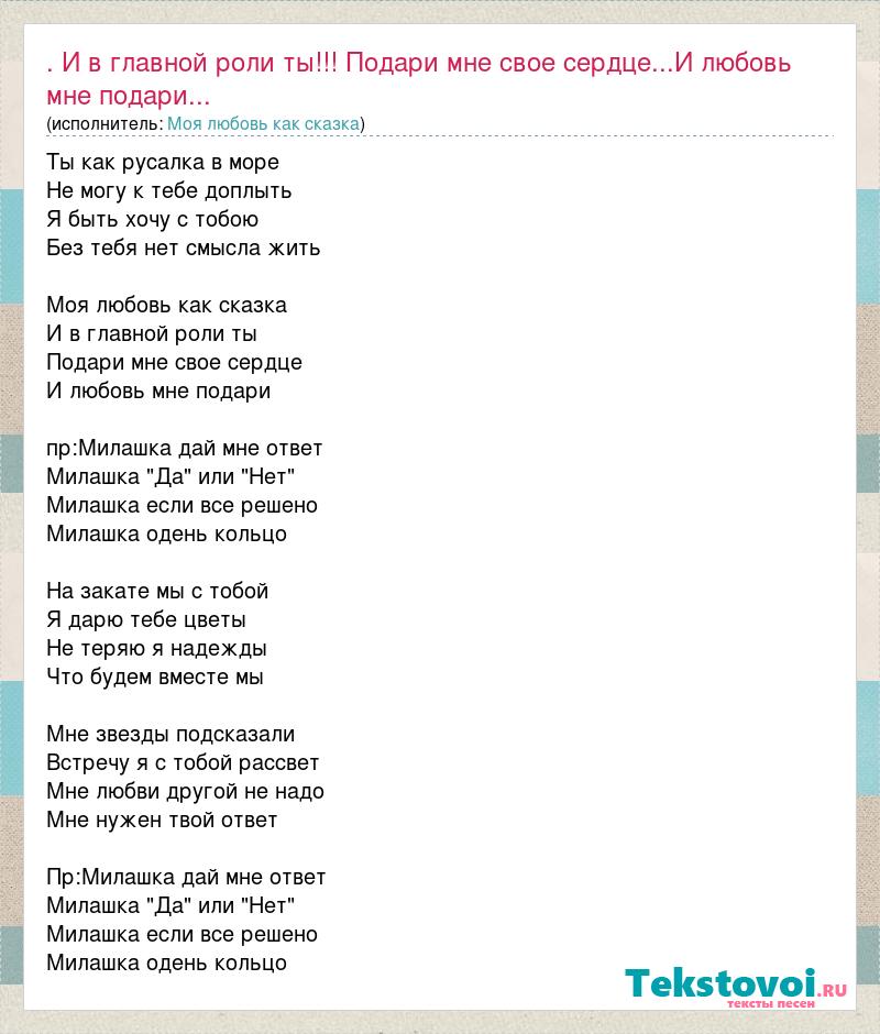 Ты как русалка в море Не могу к тебе доплыть Я быть хочу с тобою Без тебя нет смысла жить Моя любовь как сказка И в главной роли ты Подари мне свое сердце И любовь мне подари пр:Милашка дай мне ответ Милашка "Да" или "Нет" Милашка если все решено Милашка одень кольцо На закате мы с тобой Я дарю тебе цветы Не теряю я надежды Что будем вместе мы Мне звезды подсказали Встречу я с тобой рассвет Мне любви другой не надо Мне нужен твой ответ Пр:Милашка дай мне ответ Милашка "Да" или "Нет" Милашка если все решено Милашка одень кольцо