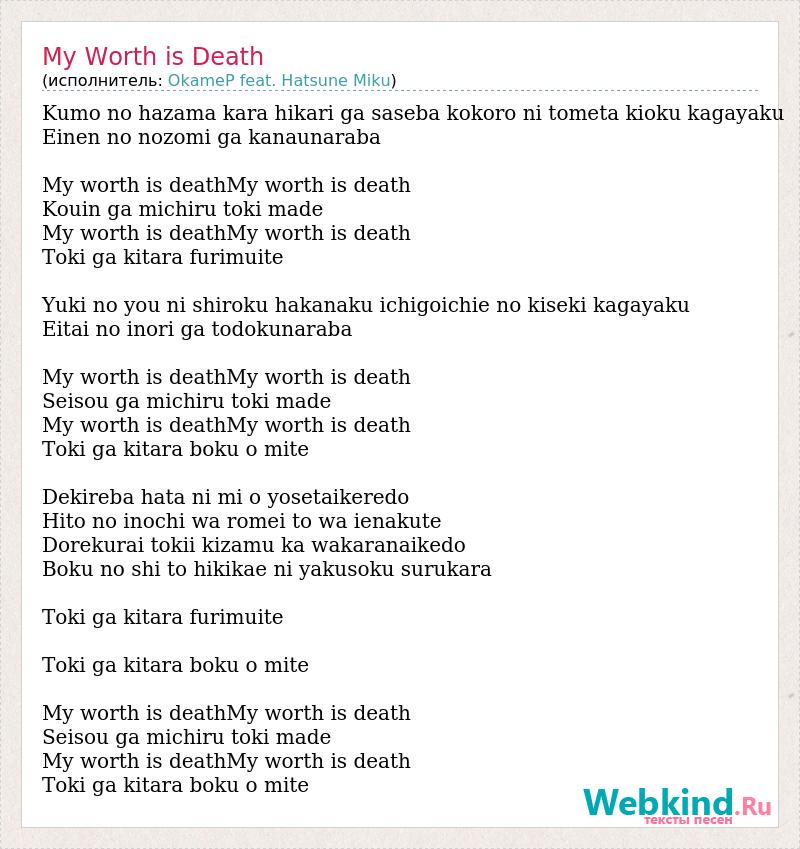 Kumo no hazama kara hikari ga saseba kokoro ni tometa kioku kagayaku Einen no nozomi ga kanaunaraba My worth is death My worth is death Kouin ga michiru toki made My worth is death My worth is death Toki ga kitara furimuite Yuki no you ni shiroku hakanaku ichigoichie no kiseki kagayaku Eitai no inori ga todokunaraba My worth is death My worth is death Seisou ga michiru toki made My worth is death My worth is death Toki ga kitara boku o mite Dekireba hata ni mi o yosetaikeredo Hito no inochi wa romei to wa ienakute Dorekurai tokii kizamu ka wakaranaikedo Boku no shi to hikikae ni yakusoku surukara Toki ga kitara furimuite Toki ga kitara boku o mite My worth is death My worth is death Seisou ga michiru toki made My worth is death My worth is death Toki ga kitara boku o mite