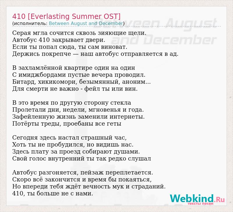 Серая мгла сочится сквозь зияющие щели. Автобус 410 закрывает двери. Если ты попал сюда, ты сам виноват. Держись покрепче — наш автобус отправляется в ад. В захламлённой квартире один на один С имиджбордами пустые вечера проводил. Битард, хикикомори, безымянный, аноним... Для смерти не важно - фейл ты или вин. В это время по другую сторону стекла Пролетали дни, недели, мгновенья и года. Зафейленную жизнь заменили интернеты. Потёрты треды, проебаны все геты Сегодня здесь настал страшный час, Хоть ты не пробудился, но видишь нас. Здесь плату за проезд собирают душами. Свой голос внутренний ты так редко слушал Автобус разгоняется, пейзаж переплетается. Скоро всё закончится и время бы покаяться, Но впереди тебя ждёт вечность мук и страданий. 410, ты больше не с нами.