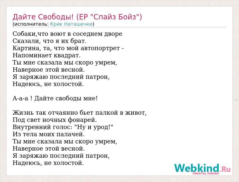 Собаки,что воют в соседнем дворе Сказали, что я их брат. Картина, та, что мой автопортрет - Напоминает квадрат. Ты мне сказала мы скоро умрем, Наверное этой весной. Я заряжаю последний патрон, Надеюсь, не холостой. А-а-а ! Дайте свободы мне! Жизнь так отчаянно бьет палкой в живот, Под свет ночных фонарей. Внутренний голос: "Ну и урод!" Из тела моих палачей. Ты мне сказала мы скоро умрем, Наверное этой весной. Я заряжаю последний патрон, Надеюсь, не холостой.
