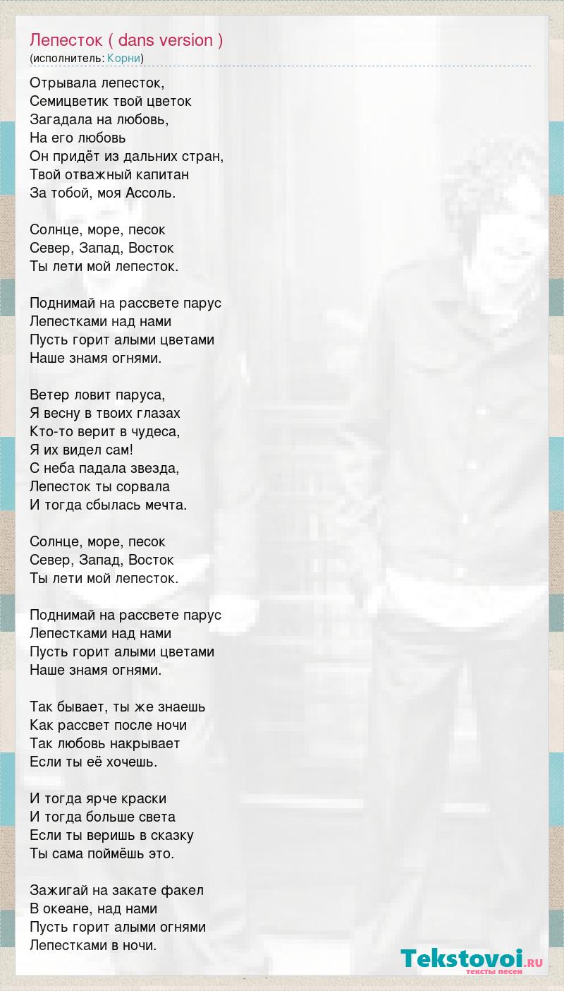 Отрывала лепесток, Семицветик твой цветок Загадала на любовь, На его любовь Он придёт из дальних стран, Твой отважный капитан За тобой, моя Ассоль. Солнце, море, песок Север, Запад, Восток Ты лети мой лепесток. Поднимай на рассвете парус Лепестками над нами Пусть горит алыми цветами Наше знамя огнями. Ветер ловит паруса, Я весну в твоих глазах Кто-то верит в чудеса, Я их видел сам! С неба падала звезда, Лепесток ты сорвала И тогда сбылась мечта. Солнце, море, песок Север, Запад, Восток Ты лети мой лепесток. Поднимай на рассвете парус Лепестками над нами Пусть горит алыми цветами Наше знамя огнями. Так бывает, ты же знаешь Как рассвет после ночи Так любовь накрывает Если ты её хочешь. И тогда ярче краски И тогда больше света Если ты веришь в сказку Ты сама поймёшь это. Зажигай на закате факел В океане, над нами Пусть горит алыми огнями Лепестками в ночи.