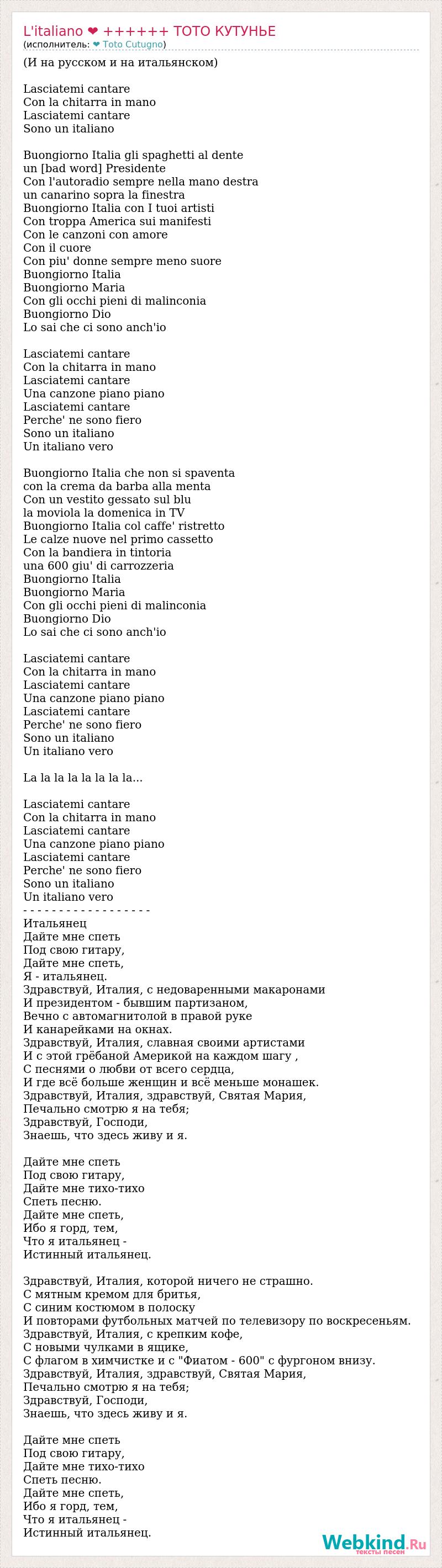 (И на русском и на итальянском) Lasciatemi cantare Con la chitarra in mano Lasciatemi cantare Sono un italiano Buongiorno Italia gli spaghetti al dente un [bad word] Presidente Con l'autoradio sempre nella mano destra un canarino sopra la finestra Buongiorno Italia con I tuoi artisti Con troppa America sui manifesti Con le canzoni con amore Con il cuore Con piu' donne sempre meno suore Buongiorno Italia Buongiorno Maria Con gli occhi pieni di malinconia Buongiorno Dio Lo sai che ci sono anch'io Lasciatemi cantare Con la chitarra in mano Lasciatemi cantare Una canzone piano piano Lasciatemi cantare Perche' ne sono fiero Sono un italiano Un italiano vero Buongiorno Italia che non si spaventa con la crema da barba alla menta Con un vestito gessato sul blu la moviola la domenica in TV Buongiorno Italia col caffe' ristretto Le calze nuove nel primo cassetto Con la bandiera in tintoria una 600 giu' di carrozzeria Buongiorno Italia Buongiorno Maria Con gli occhi pieni di malinconia Buongiorno Dio Lo sai che ci sono anch'io Lasciatemi cantare Con la chitarra in mano Lasciatemi cantare Una canzone piano piano Lasciatemi cantare Perche' ne sono fiero Sono un italiano Un italiano vero La la la la la la la la... Lasciatemi cantare Con la chitarra in mano Lasciatemi cantare Una canzone piano piano Lasciatemi cantare Perche' ne sono fiero Sono un italiano Un italiano vero - - - - - - - - - - - - - - - - - - Итальянец Дайте мне спеть Под свою гитару, Дайте мне спеть, Я - итальянец. Здравствуй, Италия, с недоваренными макаронами И президентом - бывшим партизаном, Вечно с автомагнитолой в правой руке И канарейками на окнах. Здравствуй, Италия, славная своими артистами И с этой грёбаной Америкой на каждом шагу , С песнями о любви от всего сердца, И где всё больше женщин и всё меньше монашек. Здравствуй, Италия, здравствуй, Святая Мария, Печально смотрю я на тебя; Здравствуй, Господи, Знаешь, что здесь живу и я. Дайте мне спеть Под свою гитару, Дайте мне тихо-тихо Cпеть песню. Дайте мне спеть, Ибо я горд, тем, Что я итальянец - Истинный итальянец. Здравствуй, Италия, которой ничего не страшно. С мятным кремом для бритья, С синим костюмом в полоску И повторами футбольных матчей по телевизору по воскресеньям. Здравствуй, Италия, с крепким кофе, С новыми чулками в ящике, С флагом в химчистке и с "Фиатом - 600" с фургоном внизу. Здравствуй, Италия, здравствуй, Святая Мария, Печально смотрю я на тебя; Здравствуй, Господи, Знаешь, что здесь живу и я. Дайте мне спеть Под свою гитару, Дайте мне тихо-тихо Cпеть песню. Дайте мне спеть, Ибо я горд, тем, Что я итальянец - Истинный итальянец.