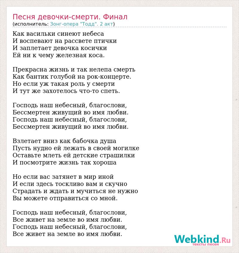 Как васильки синеют небеса И воспевают на рассвете птички И заплетает девочка косички Ей ни к чему железная коса. Прекрасна жизнь и так нелепа смерть Как бантик голубой на рок-концерте. Но если уж такая роль у смерти И тут же захотелось что-то спеть. Господь наш небесный, благослови, Бессмертен живущий во имя любви. Господь наш небесный, благослови, Бессмертен живущий во имя любви. Взлетает вниз как бабочка душа Пусть нудно ей лежать в своей могилке Оставьте млеть ей детские страшилки И посмотрите жизнь так хороша Но если вас затянет в мир иной И если здесь тоскливо вам и скучно Страдать и ждать и мучиться не нужно Вы можете отправиться со мной. Господь наш небесный, благослови, Все живет на земле во имя любви. Господь наш небесный, благослови, Все живет на земле во имя любви.