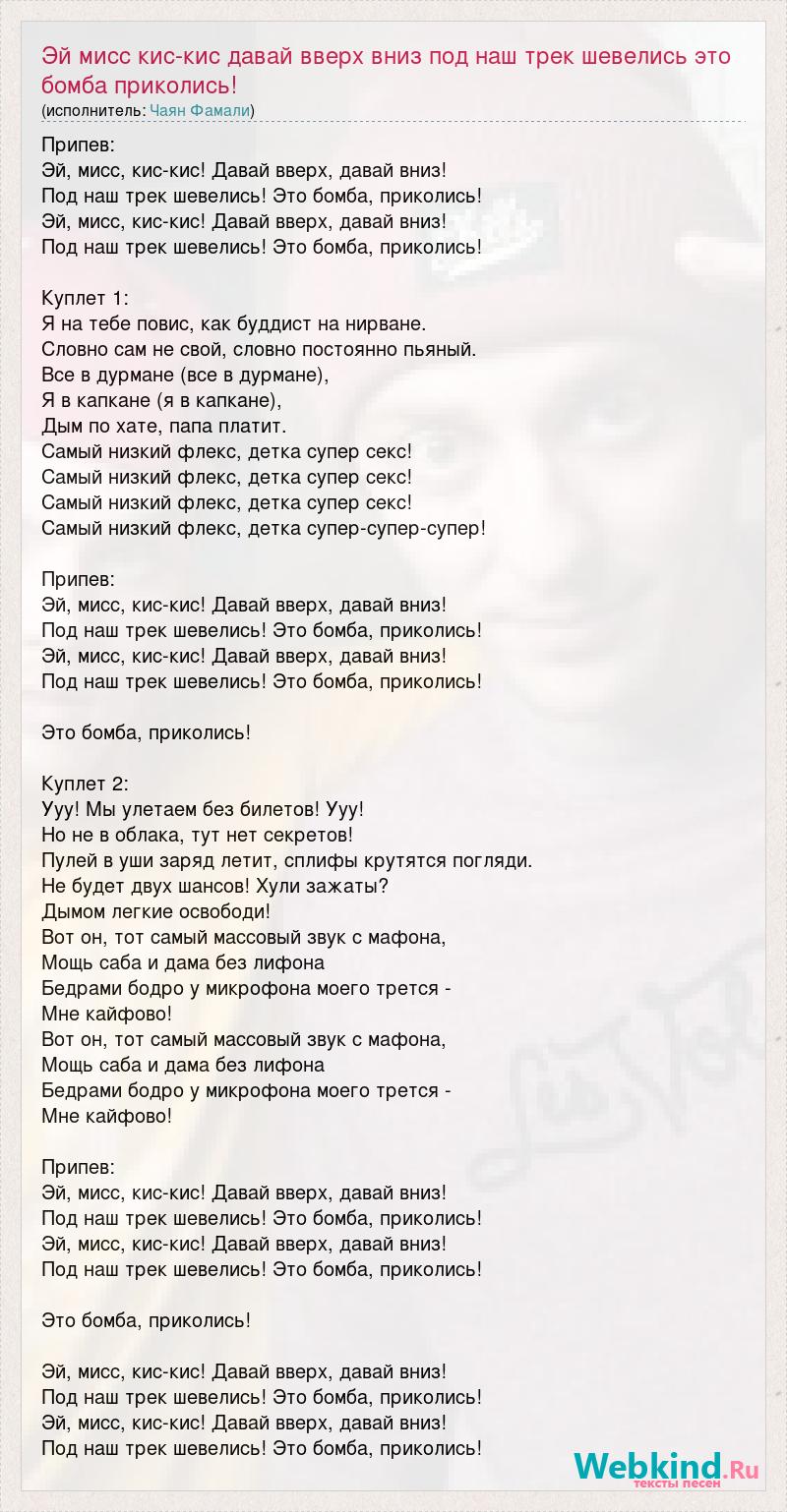 Припев: Эй, мисс, кис-кис! Давай вверх, давай вниз! Под наш трек шевелись! Это бомба, приколись! Эй, мисс, кис-кис! Давай вверх, давай вниз! Под наш трек шевелись! Это бомба, приколись! Куплет 1: Я на тебе повис, как буддист на нирване. Словно сам не свой, словно постоянно пьяный. Все в дурмане (все в дурмане), Я в капкане (я в капкане), Дым по хате, папа платит. Самый низкий флекс, детка супер секс! Самый низкий флекс, детка супер секс! Самый низкий флекс, детка супер секс! Самый низкий флекс, детка супер-супер-супер! Припев: Эй, мисс, кис-кис! Давай вверх, давай вниз! Под наш трек шевелись! Это бомба, приколись! Эй, мисс, кис-кис! Давай вверх, давай вниз! Под наш трек шевелись! Это бомба, приколись! Это бомба, приколись! Куплет 2: Ууу! Мы улетаем без билетов! Ууу! Но не в облака, тут нет секретов! Пулей в уши заряд летит, сплифы крутятся погляди. Не будет двух шансов! Хули зажаты? Дымом легкие освободи! Вот он, тот самый массовый звук с мафона, Мощь саба и дама без лифона Бедрами бодро у микрофона моего трется - Мне кайфово! Вот он, тот самый массовый звук с мафона, Мощь саба и дама без лифона Бедрами бодро у микрофона моего трется - Мне кайфово! Припев: Эй, мисс, кис-кис! Давай вверх, давай вниз! Под наш трек шевелись! Это бомба, приколись! Эй, мисс, кис-кис! Давай вверх, давай вниз! Под наш трек шевелись! Это бомба, приколись! Это бомба, приколись! Эй, мисс, кис-кис! Давай вверх, давай вниз! Под наш трек шевелись! Это бомба, приколись! Эй, мисс, кис-кис! Давай вверх, давай вниз! Под наш трек шевелись! Это бомба, приколись!