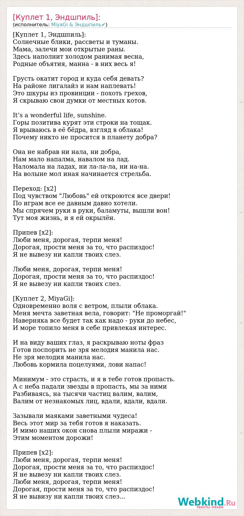 [Куплет 1, Эндшпиль]: Солнечные блики, рассветы и туманы. Мама, залечи мои открытые раны. Здесь наполнит холодом ранимая весна, Родные объятия, манна - в них весь я! Грусть окатит город и куда себя девать? На районе лигалайз и нам наплевать! Это шкуры из провинции - похоть грехов, Я скрываю свои думки от местных котов. It’s a wonderful life, sunshine. Горы позитива курят эти строки на тощак. Я врываюсь в её бёдра, взгляд в облака! Почему никто не просится в планету добра? Она не набрав ни нала, ни добра, Нам мало напалма, навалом на лад. Наломала на ладах, ни ла-ла-ла, ни на-на. На волыне мол иная начинается стрельба. Переход: [х2] Под чувством "Любовь" ей откроются все двери! По играм все ее давным давно хотели. Мы спрячем руки в руки, баламуты, вышли вон! Тут моя жизнь, и я ей окрылён. Припев [х2]: Люби меня, дорогая, терпи меня! Дорогая, прости меня за то, что распиздос! Я не вывезу ни капли твоих слез. Люби меня, дорогая, терпи меня! Дорогая, прости меня за то, что распиздос! Я не вывезу ни капли твоих слез. [Куплет 2, MiyaGi]: Одновременно воля с ветром, плыли облака. Меня мечта заветная вела, говорит: "Не проморгай!" Наверняка все будет так как надо - руки до небес, И море топило меня в себе привлекая интерес. И на виду ваших глаз, я раскрываю ноты фраз Готов поспорить не зря мелодия манила нас. Не зря мелодия манила нас. Любовь кормила поцелуями, лови напас! Минимум - это страсть, и я в тебе готов пропасть. А с неба падали звезды в пропасть, мы за ними Разбиваясь, на тысячи частиц валим, валим, Валим от незнакомых лиц, вдали, вдали, вдали. Зазывали маяками заветными чудеса! Весь этот мир за тебя готов я наказать. И мимо наших окон снова плыли миражи - Этим моментом дорожи! Припев [х2]: Люби меня, дорогая, терпи меня! Дорогая, прости меня за то, что распиздос! Я не вывезу ни капли твоих слез. Люби меня, дорогая, терпи меня! Дорогая, прости меня за то, что распиздос! Я не вывизу ни капли твоих слез...