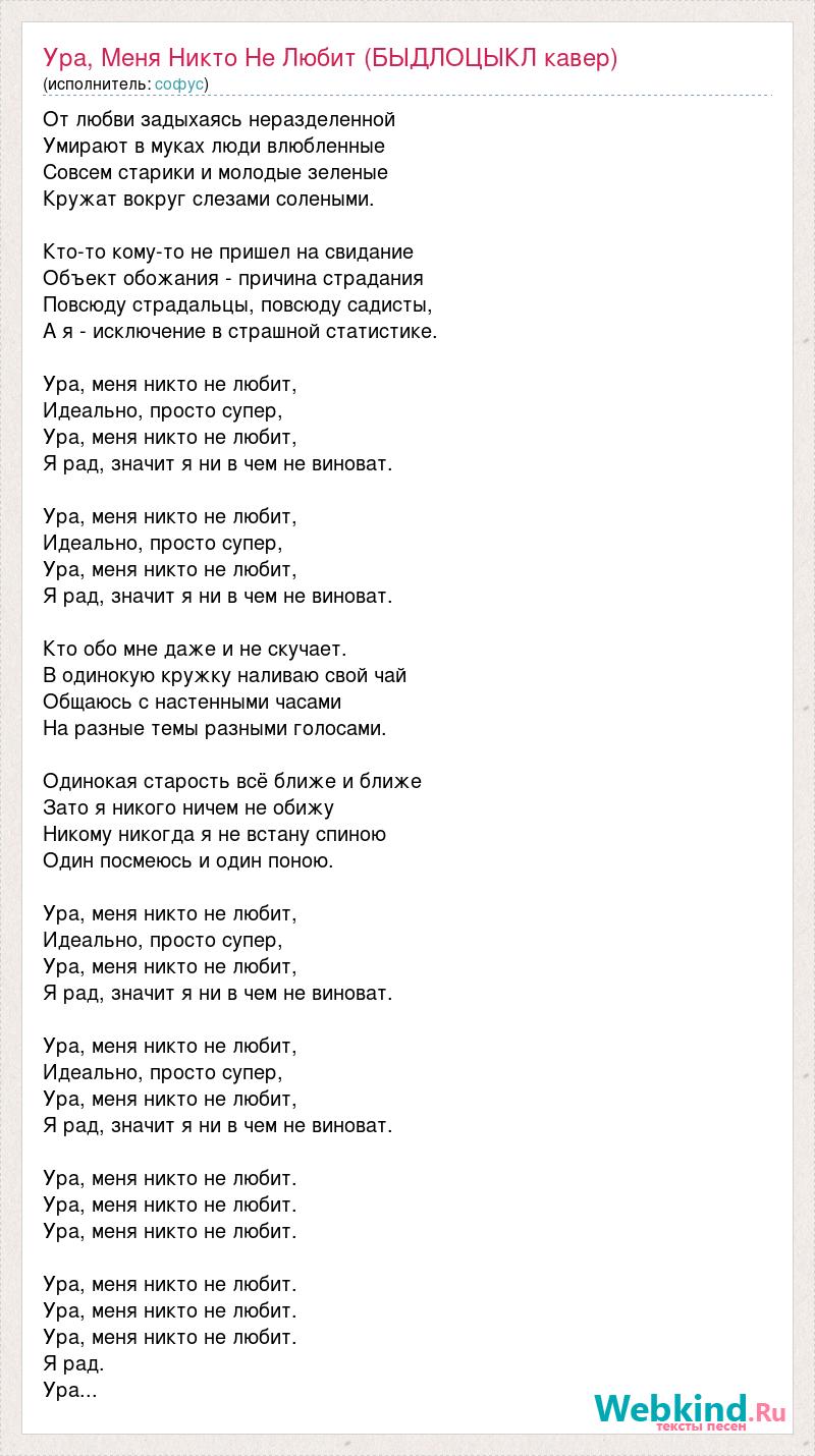 От любви задыхаясь неразделенной Умирают в муках люди влюбленные Совсем старики и молодые зеленые Кружат вокруг слезами солеными. Кто-то кому-то не пришел на свидание Объект обожания - причина страдания Повсюду страдальцы, повсюду садисты, А я - исключение в страшной статистике. Ура, меня никто не любит, Идеально, просто супер, Ура, меня никто не любит, Я рад, значит я ни в чем не виноват. Ура, меня никто не любит, Идеально, просто супер, Ура, меня никто не любит, Я рад, значит я ни в чем не виноват. Кто обо мне даже и не скучает. В одинокую кружку наливаю свой чай Общаюсь с настенными часами На разные темы разными голосами. Одинокая старость всё ближе и ближе Зато я никого ничем не обижу Никому никогда я не встану спиною Один посмеюсь и один поною. Ура, меня никто не любит, Идеально, просто супер, Ура, меня никто не любит, Я рад, значит я ни в чем не виноват. Ура, меня никто не любит, Идеально, просто супер, Ура, меня никто не любит, Я рад, значит я ни в чем не виноват. Ура, меня никто не любит. Ура, меня никто не любит. Ура, меня никто не любит. Ура, меня никто не любит. Ура, меня никто не любит. Ура, меня никто не любит. Я рад. Ура...