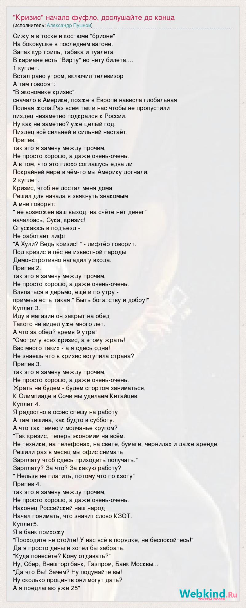 Сижу я в тоске и костюме "брионе" На боковушке в последнем вагоне. Запах кур гриль, табака и туалета В кармане есть "Вирту" но нету билета.... 1 куплет. Встал рано утром, включил телевизор А там говорят: "В экономике кризис" сначало в Америке, позже в Европе нависла глобальная Полная жопа.Раз всем так и нас чтобы не пропустили пиздец незаметно подкрался к России. Ну как не заметно? уже целый год, Пиздец всё сильней и сильней настаёт. Припев. так это я замечу между прочим, Не просто хорошо, а даже очень-очень. А в том, что это плохо соглашусь едва ли Покрайней мере в чём-то мы Америку догнали. 2 куплет. Кризис, чтоб не достал меня дома Решил для начала я звякнуть знакомым А мне говорят: " не возможен ваш выход. на счёте нет денег" началоась, Сука, кризис! Спускаюсь в подъезд - Не работает лифт "А Хули? Ведь кризис! " - лифтёр говорит. Под кризис и пёс не известной пароды Демонстротивно нагадил у входа. Припев 2. так это я замечу между прочим, Не просто хорошо, а даже очень-очень. Вляпаться в дерьмо, ещё и по утру - примеьа есть такая:" Быть богатству и добру!" Куплет 3. Иду в магазин он закрыт на обед Такого не видел уже много лет. А что за обед? время 9 утра! "Смотри у всех кризис, а этому жрать! Вас много таких - а я сдесь одна! Не знаешь что в кризис вступила страна? Припев 3. так это я замечу между прочим, Не просто хорошо, а даже очень-очень. Жрать не будем - будем спортом заниматься, К Олимпиаде в Сочи мы уделаем Китайцев. Куплет 4. Я радостно в офис спешу на работу А там тишина, как будто в субботу. А что так темно и молчанье кругом? "Так кризис, теперь экономим на всём. Не технике, на телефонах, на свете, бумаге, чернилах и даже аренде. Решили раз в месяц мы офис снимать Зарплату чтоб сдесь приходить получать." Зарплату? За что? За какую работу? " Нельзя не платить, потому что по кзоту" Припев 4. так это я замечу между прочим, Не просто хорошо, а даже очень-очень. Наконец Российский наш народ Начал понимать, что значит слово КЗОТ. Куплет5. Я в банк прихожу "Проходите не стойте! У нас всё в порядке, не беспокойтесь!" Да я просто деньги хотел бы забрать. "Куда понесёте? Кому отдавать?" Ну, Сбер, Внешторгбанк, Газпром, Банк Москвы... "Да что Вы! Зачем? Ну подумайте вы! Ну сколько процентв они могут дать? А я предлагаю уже 25"