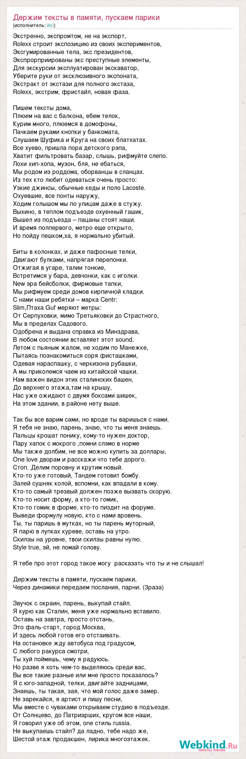 Экстренно, экспромтом, не на экспорт, Rolexx строит экспозицию из своих экспериментов, Эксгумированные тела, экс президентов, Экспрорприированы экс преступные элементы, Для экскурсии эксплуатирован экскаватор, Уберите руки от эксклюзивного экспоната, Экстракт от экстази для полного экстаза, Rolexx, экстрим, фристайл, новая фаза. Пишем тексты дома, Плюем на вас с балкона, ебем телок, Курим много, плюемся в домофоны, Пачкаем руками кнопки у банкомата, Слушаем Шуфика и Круга на своих блатхатах. Все хуево, пришла пора детского рэпа, Хватит фильтровать базар, слышь, рифмуйте слепо. Лохи хип-хопа, музон, бля, не ебаться, Мы родом из роддома, оборванцы в сланцах. Из тех кто любит одеваться очень просто: Узкие джинсы, обычные кеды и поло Lacoste. Охуевшие, все понты наружу, Ходим голышом мы по улицам даже в стужу. Выхино, в теплом подъезде охуенный гашик, Вышел из подъезда – пацаны стоят наши. И время полпервого, метро еще открыто, Но пойду пешком,ха, я нормально убитый. Биты в колонкaх, и даже пафосные телки, Двигают булками, напрягая перепонки. Отжигая в угаре, талии тонкие, Встретимся у бара, девчонки, как с иголки. New эра бейсболки, фирмовые тапки, Мы рифмуем среди домов кирпичной кладки. С нами наши ребятки – марка Centr: Slim,Птаха Guf меряют метры: От Серпуховки, мимо Третьяковки до Страстного, Мы в пределах Садового. Одобрена и выдана справка из Минздрава, В любом состоянии вставляет этот sound. Летом с пьяным жалом, не ходим по Манежке, Пытаясь познакомиться соря фисташками, Одевая нараспашку, с черкизона рубашки, А мы приколемся чаем из китайской чашки. Нам важен видон этих сталинских башен, До верхнего этажа,там на крышу, Нас уже ожидают с двумя боксами шишек, На этом здании, в районе нету выше. Так бы все варим сами, но вроде ты варишься с нами. Я тебя не знаю, парень, знаю, что ты меня знаешь. Пальцы крошат понику, кому-то нужен доктор, Пару хапок с мокрого ,помни слэмо в норме Мы также долбим, не все можно купить за доллары, Оne love дворам и расскажи что тебе дорого. Стоп. Делим поровну и крутим новый. Кто-то уже готовый, Тандем готовит бомбу. Залей сушняк колой, вспомни, как впадали в кому. Кто-то самый трезвый должен позже вызвать скорую. Кто-то носит форму, а кто-то гомик, Кто-то гомик в форме, кто-то пиздит на форуме. Выведи формулу новую, кто с нами вровень. Ты, ты паришь в мутках, но ты парень муторный, Я парю в лупках куреве, оставь на утро. Скилзы на уровне, твои скилзы равны нулю. Style true, эй, не ломай голову. Я тебе про этот город такое могу расказать что ты и не слышал! Держим тексты в памяти, пускаем парики, Через динамики передаем послания, парни. (3раза) Звучок с окраин, парень, выкупай стайл. Я курю как Сталин, меня уже нормально вставило. Оставь на завтра, просто отстань, Это фаль-старт, город Москва, И здесь любой готов его отстаивать. На остановке жду автобуса под градусом, С любого ракурса смотри, Ты хуй поймешь, чему я радуюсь. Но разве я хоть чем-то выделяюсь среди вас, Вы все такие разные или мне просто показалось? Я с юго-западной, телки, двигайте задницами, Знаешь, ты такая, зая, что мой голос даже замер. Не зарекайся, я артист и пишу песни, Мы вместе с чуваками открываем студию в подъезде. От Солнцево, до Патриарших, кругом все наши, Я говорил уже об этом, one стиль russia. Не выкупаешь стайл? да ладно, тебе надо же, Шестой этаж продакшен, лирика многоэтажек.