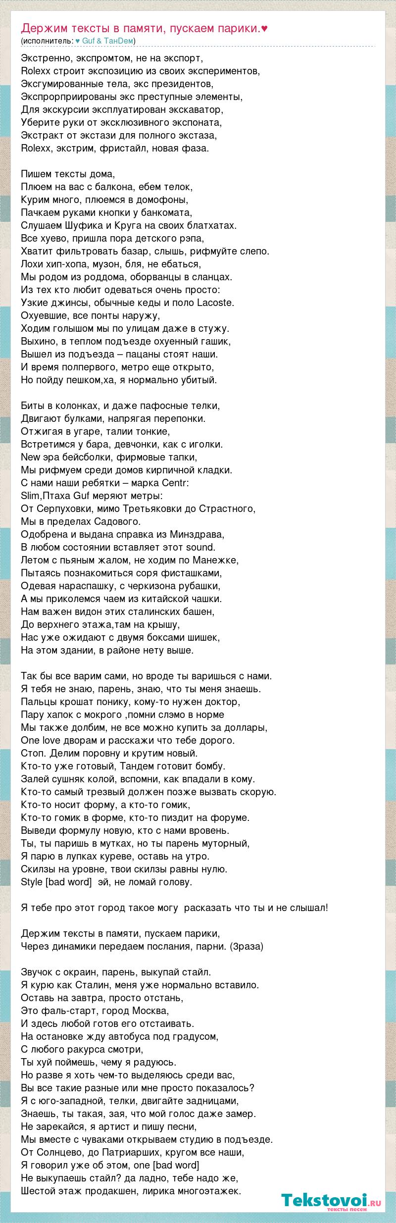 Экстренно, экспромтом, не на экспорт, Rolexx строит экспозицию из своих экспериментов, Эксгумированные тела, экс президентов, Экспрорприированы экс преступные элементы, Для экскурсии эксплуатирован экскаватор, Уберите руки от эксклюзивного экспоната, Экстракт от экстази для полного экстаза, Rolexx, экстрим, фристайл, новая фаза. Пишем тексты дома, Плюем на вас с балкона, ебем телок, Курим много, плюемся в домофоны, Пачкаем руками кнопки у банкомата, Слушаем Шуфика и Круга на своих блатхатах. Все хуево, пришла пора детского рэпа, Хватит фильтровать базар, слышь, рифмуйте слепо. Лохи хип-хопа, музон, бля, не ебаться, Мы родом из роддома, оборванцы в сланцах. Из тех кто любит одеваться очень просто: Узкие джинсы, обычные кеды и поло Lacoste. Охуевшие, все понты наружу, Ходим голышом мы по улицам даже в стужу. Выхино, в теплом подъезде охуенный гашик, Вышел из подъезда – пацаны стоят наши. И время полпервого, метро еще открыто, Но пойду пешком,ха, я нормально убитый. Биты в колонкaх, и даже пафосные телки, Двигают булками, напрягая перепонки. Отжигая в угаре, талии тонкие, Встретимся у бара, девчонки, как с иголки. New эра бейсболки, фирмовые тапки, Мы рифмуем среди домов кирпичной кладки. С нами наши ребятки – марка Centr: Slim,Птаха Guf меряют метры: От Серпуховки, мимо Третьяковки до Страстного, Мы в пределах Садового. Одобрена и выдана справка из Минздрава, В любом состоянии вставляет этот sound. Летом с пьяным жалом, не ходим по Манежке, Пытаясь познакомиться соря фисташками, Одевая нараспашку, с черкизона рубашки, А мы приколемся чаем из китайской чашки. Нам важен видон этих сталинских башен, До верхнего этажа,там на крышу, Нас уже ожидают с двумя боксами шишек, На этом здании, в районе нету выше. Так бы все варим сами, но вроде ты варишься с нами. Я тебя не знаю, парень, знаю, что ты меня знаешь. Пальцы крошат понику, кому-то нужен доктор, Пару хапок с мокрого ,помни слэмо в норме Мы также долбим, не все можно купить за доллары, Оne love дворам и расскажи что тебе дорого. Стоп. Делим поровну и крутим новый. Кто-то уже готовый, Тандем готовит бомбу. Залей сушняк колой, вспомни, как впадали в кому. Кто-то самый трезвый должен позже вызвать скорую. Кто-то носит форму, а кто-то гомик, Кто-то гомик в форме, кто-то пиздит на форуме. Выведи формулу новую, кто с нами вровень. Ты, ты паришь в мутках, но ты парень муторный, Я парю в лупках куреве, оставь на утро. Скилзы на уровне, твои скилзы равны нулю. Style true, эй, не ломай голову. Я тебе про этот город такое могу расказать что ты и не слышал! Держим тексты в памяти, пускаем парики, Через динамики передаем послания, парни. (3раза) Звучок с окраин, парень, выкупай стайл. Я курю как Сталин, меня уже нормально вставило. Оставь на завтра, просто отстань, Это фаль-старт, город Москва, И здесь любой готов его отстаивать. На остановке жду автобуса под градусом, С любого ракурса смотри, Ты хуй поймешь, чему я радуюсь. Но разве я хоть чем-то выделяюсь среди вас, Вы все такие разные или мне просто показалось? Я с юго-западной, телки, двигайте задницами, Знаешь, ты такая, зая, что мой голос даже замер. Не зарекайся, я артист и пишу песни, Мы вместе с чуваками открываем студию в подъезде. От Солнцево, до Патриарших, кругом все наши, Я говорил уже об этом, one стиль russia. Не выкупаешь стайл? да ладно, тебе надо же, Шестой этаж продакшен, лирика многоэтажек.
