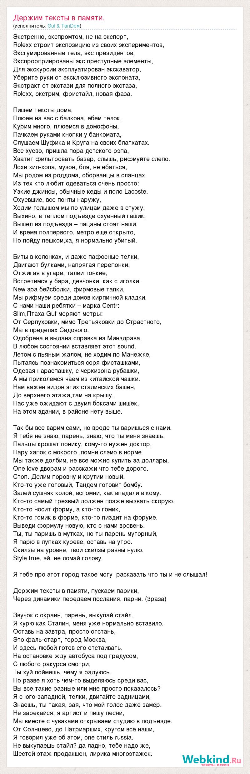 Экстренно, экспромтом, не на экспорт, Rolexx строит экспозицию из своих экспериментов, Эксгумированные тела, экс президентов, Экспрорприированы экс преступные элементы, Для экскурсии эксплуатирован экскаватор, Уберите руки от эксклюзивного экспоната, Экстракт от экстази для полного экстаза, Rolexx, экстрим, фристайл, новая фаза. Пишем тексты дома, Плюем на вас с балкона, ебем телок, Курим много, плюемся в домофоны, Пачкаем руками кнопки у банкомата, Слушаем Шуфика и Круга на своих блатхатах. Все хуево, пришла пора детского рэпа, Хватит фильтровать базар, слышь, рифмуйте слепо. Лохи хип-хопа, музон, бля, не ебаться, Мы родом из роддома, оборванцы в сланцах. Из тех кто любит одеваться очень просто: Узкие джинсы, обычные кеды и поло Lacoste. Охуевшие, все понты наружу, Ходим голышом мы по улицам даже в стужу. Выхино, в теплом подъезде охуенный гашик, Вышел из подъезда – пацаны стоят наши. И время полпервого, метро еще открыто, Но пойду пешком,ха, я нормально убитый. Биты в колонкaх, и даже пафосные телки, Двигают булками, напрягая перепонки. Отжигая в угаре, талии тонкие, Встретимся у бара, девчонки, как с иголки. New эра бейсболки, фирмовые тапки, Мы рифмуем среди домов кирпичной кладки. С нами наши ребятки – марка Centr: Slim,Птаха Guf меряют метры: От Серпуховки, мимо Третьяковки до Страстного, Мы в пределах Садового. Одобрена и выдана справка из Минздрава, В любом состоянии вставляет этот sound. Летом с пьяным жалом, не ходим по Манежке, Пытаясь познакомиться соря фисташками, Одевая нараспашку, с черкизона рубашки, А мы приколемся чаем из китайской чашки. Нам важен видон этих сталинских башен, До верхнего этажа,там на крышу, Нас уже ожидают с двумя боксами шишек, На этом здании, в районе нету выше. Так бы все варим сами, но вроде ты варишься с нами. Я тебя не знаю, парень, знаю, что ты меня знаешь. Пальцы крошат понику, кому-то нужен доктор, Пару хапок с мокрого ,помни слэмо в норме Мы также долбим, не все можно купить за доллары, Оne love дворам и расскажи что тебе дорого. Стоп. Делим поровну и крутим новый. Кто-то уже готовый, Тандем готовит бомбу. Залей сушняк колой, вспомни, как впадали в кому. Кто-то самый трезвый должен позже вызвать скорую. Кто-то носит форму, а кто-то гомик, Кто-то гомик в форме, кто-то пиздит на форуме. Выведи формулу новую, кто с нами вровень. Ты, ты паришь в мутках, но ты парень муторный, Я парю в лупках куреве, оставь на утро. Скилзы на уровне, твои скилзы равны нулю. Style true, эй, не ломай голову. Я тебе про этот город такое могу расказать что ты и не слышал! Держим тексты в памяти, пускаем парики, Через динамики передаем послания, парни. (3раза) Звучок с окраин, парень, выкупай стайл. Я курю как Сталин, меня уже нормально вставило. Оставь на завтра, просто отстань, Это фаль-старт, город Москва, И здесь любой готов его отстаивать. На остановке жду автобуса под градусом, С любого ракурса смотри, Ты хуй поймешь, чему я радуюсь. Но разве я хоть чем-то выделяюсь среди вас, Вы все такие разные или мне просто показалось? Я с юго-западной, телки, двигайте задницами, Знаешь, ты такая, зая, что мой голос даже замер. Не зарекайся, я артист и пишу песни, Мы вместе с чуваками открываем студию в подъезде. От Солнцево, до Патриарших, кругом все наши, Я говорил уже об этом, one стиль russia. Не выкупаешь стайл? да ладно, тебе надо же, Шестой этаж продакшен, лирика многоэтажек.