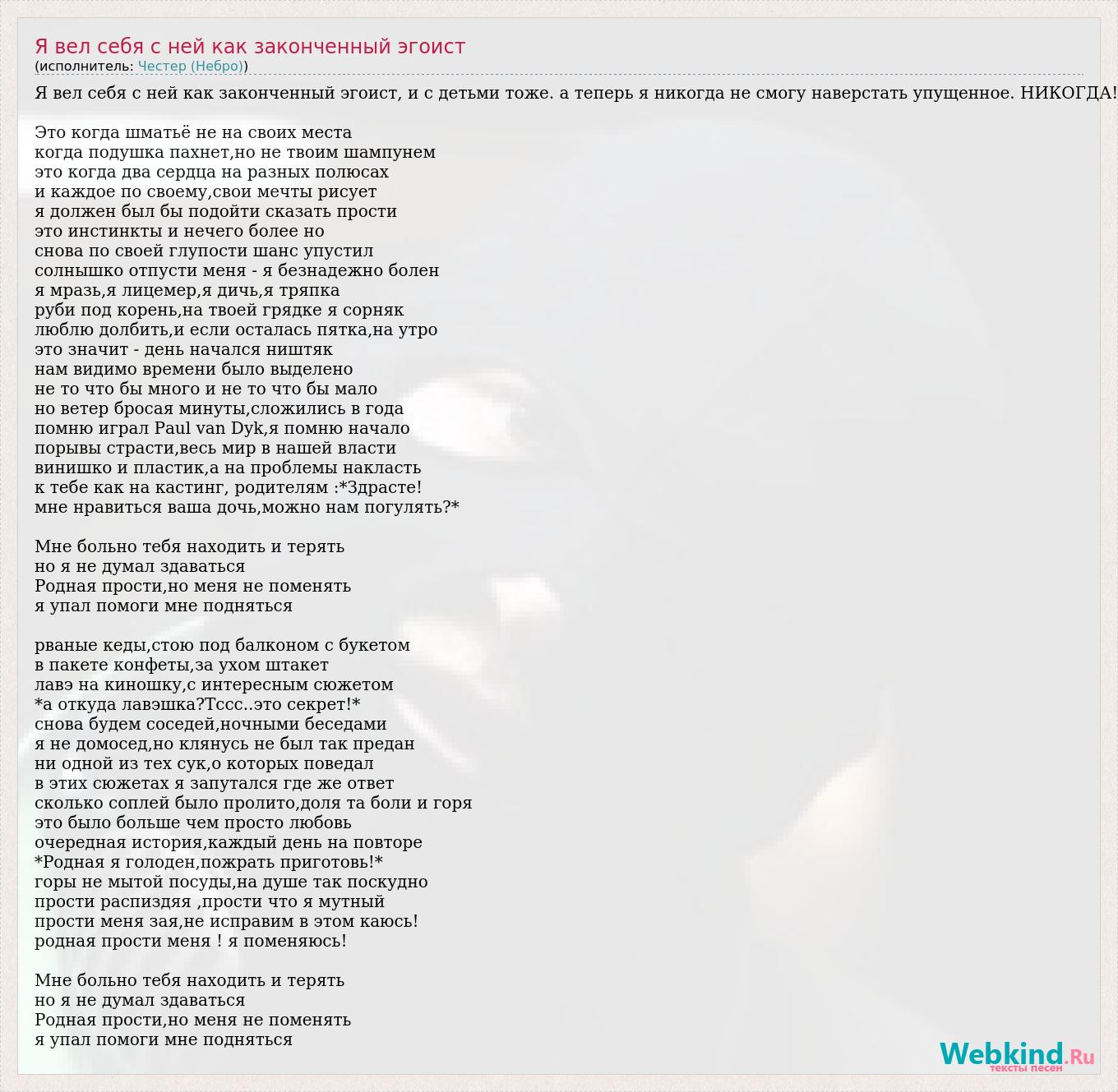 Я вел себя с ней как законченный эгоист, и с детьми тоже. а теперь я никогда не смогу наверстать упущенное. НИКОГДА! Это когда шматьё не на своих места когда подушка пахнет,но не твоим шампунем это когда два сердца на разных полюсах и каждое по своему,свои мечты рисует я должен был бы подойти сказать прости это инстинкты и нечего более но снова по своей глупости шанс упустил солнышко отпусти меня - я безнадежно болен я мразь,я лицемер,я дичь,я тряпка руби под корень,на твоей грядке я сорняк люблю долбить,и если осталась пятка,на утро это значит - день начался ништяк нам видимо времени было выделено не то что бы много и не то что бы мало но ветер бросая минуты,сложились в года помню играл Paul van Dyk,я помню начало порывы страсти,весь мир в нашей власти винишко и пластик,а на проблемы накласть к тебе как на кастинг, родителям :*Здрасте! мне нравиться ваша дочь,можно нам погулять?* Мне больно тебя находить и терять но я не думал здаваться Родная прости,но меня не поменять я упал помоги мне подняться рваные кеды,стою под балконом с букетом в пакете конфеты,за ухом штакет лавэ на киношку,с интересным сюжетом *а откуда лавэшка?Тссс..это секрет!* снова будем соседей,ночными беседами я не домосед,но клянусь не был так предан ни одной из тех сук,о которых поведал в этих сюжетах я запутался где же ответ сколько соплей было пролито,доля та боли и горя это было больше чем просто любовь очередная история,каждый день на повторе *Родная я голоден,пожрать приготовь!* горы не мытой посуды,на душе так поскудно прости распиздяя ,прости что я мутный прости меня зая,не исправим в этом каюсь! родная прости меня ! я поменяюсь! Мне больно тебя находить и терять но я не думал здаваться Родная прости,но меня не поменять я упал помоги мне подняться