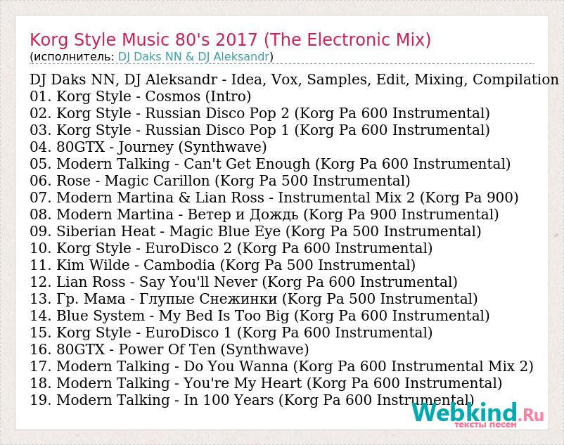 DJ Daks NN, DJ Aleksandr - Idea, Vox, Samples, Edit, Mixing, Compilation 01. Korg Style - Cosmos (Intro) 02. Korg Style - Russian Disco Pop 2 (Korg Pa 600 Instrumental) 03. Korg Style - Russian Disco Pop 1 (Korg Pa 600 Instrumental) 04. 80GTX - Journey (Synthwave) 05. Modern Talking - Can't Get Enough (Korg Pa 600 Instrumental) 06. Rose - Magic Carillon (Korg Pa 500 Instrumental) 07. Modern Martina & Lian Ross - Instrumental Mix 2 (Korg Pa 900) 08. Modern Martina - Ветер и Дождь (Korg Pa 900 Instrumental) 09. Siberian Heat - Magic Blue Eye (Korg Pa 500 Instrumental) 10. Korg Style - EuroDisco 2 (Korg Pa 600 Instrumental) 11. Kim Wilde - Cambodia (Korg Pa 500 Instrumental) 12. Lian Ross - Say You'll Never (Korg Pa 600 Instrumental) 13. Гр. Мама - Глупые Снежинки (Korg Pa 500 Instrumental) 14. Blue System - My Bed Is Too Big (Korg Pa 600 Instrumental) 15. Korg Style - EuroDisco 1 (Korg Pa 600 Instrumental) 16. 80GTX - Power Of Ten (Synthwave) 17. Modern Talking - Do You Wanna (Korg Pa 600 Instrumental Mix 2) 18. Modern Talking - You're My Heart (Korg Pa 600 Instrumental) 19. Modern Talking - In 100 Years (Korg Pa 600 Instrumental)