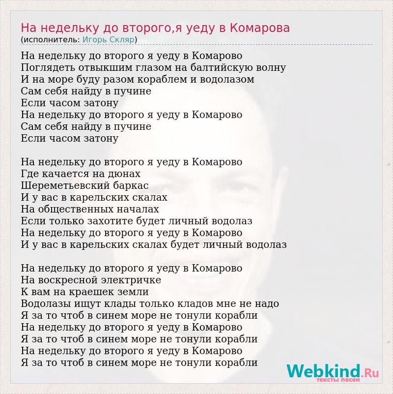 На недельку до второго я уеду в Комарово Поглядеть отвыкшим глазом на балтийскую волну И на море буду разом кораблем и водолазом Сам себя найду в пучине Если часом затону На недельку до второго я уеду в Комарово Сам себя найду в пучине Если часом затону На недельку до второго я уеду в Комарово Где качается на дюнах Шереметьевский баркас И у вас в карельских скалах На общественных началах Если только захотите будет личный водолаз На недельку до второго я уеду в Комарово И у вас в карельских скалах будет личный водолаз На недельку до второго я уеду в Комарово На воскресной электричке К вам на краешек земли Водолазы ищут клады только кладов мне не надо Я за то чтоб в синем море не тонули корабли На недельку до второго я уеду в Комарово Я за то чтоб в синем море не тонули корабли На недельку до второго я уеду в Комарово Я за то чтоб в синем море не тонули корабли